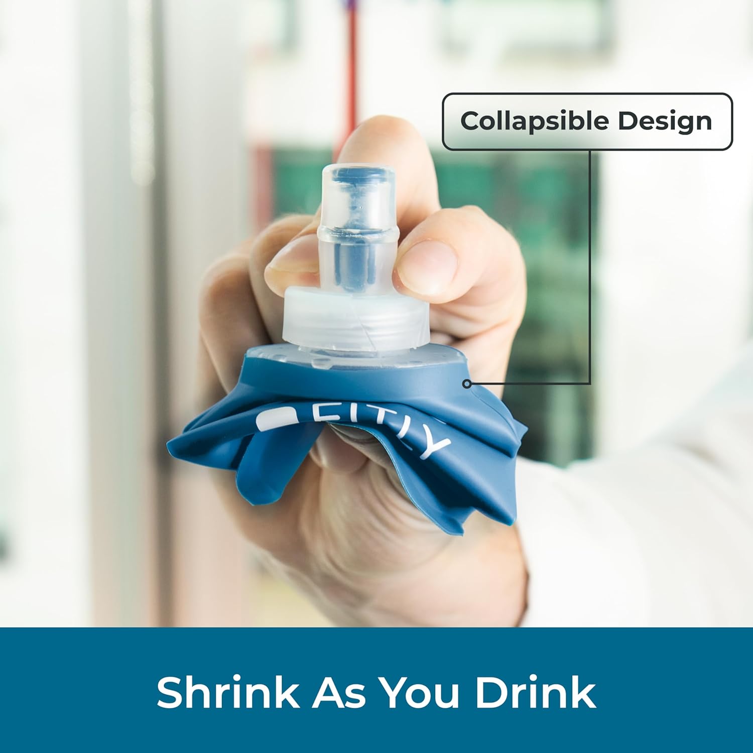 - HYDRATION ON THE MOVE: Our collapsible running soft flask is a compact and eco-friendly way to stay hydrated on the move! The soft water bottle is the perfect hydration tool for active individuals. Our soft water bottles for runners shrink as you drink, taking up minimal space and won’t slosh around, making it perfect for running, hiking, skiing, or any rigorous activity. Now available in a Petrol Blue color option.