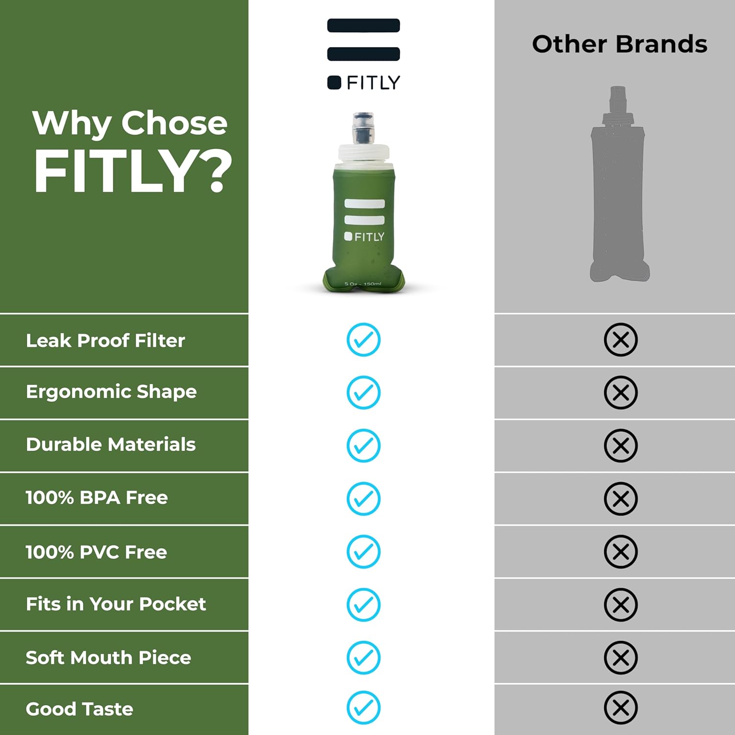 - STAY LIGHT ON YOUR FEET: FITLY’s collapsible flask is purposely lightweight, ensuring you stay light on your feet and not weighted down by unnecessary bulk. At FITLY, reusability is deeply important to us, and our water bladder is no exception. Enjoy limitless use from our portable soft water bottle for running vest that is 100% BPA & PVC-free.