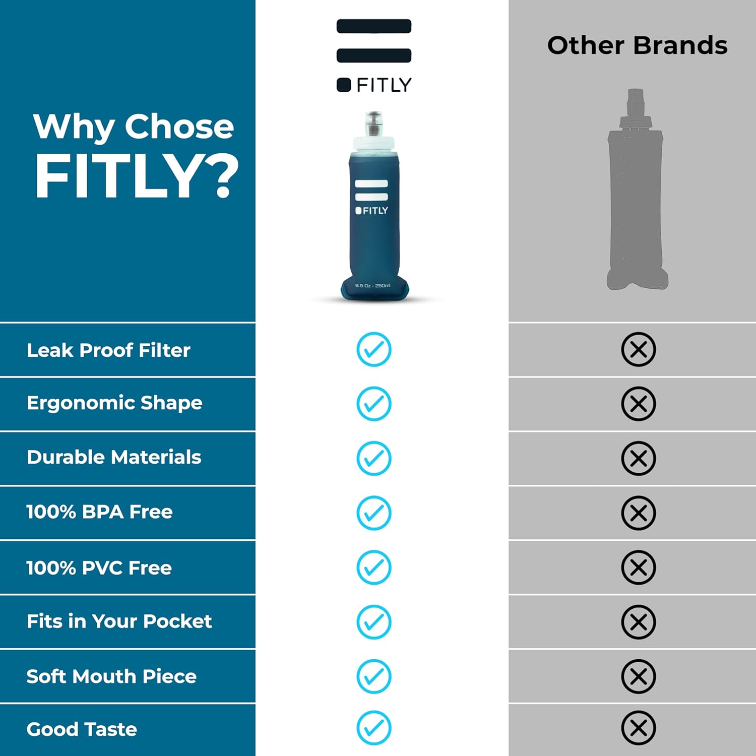 - STAY LIGHT ON YOUR FEET: FITLY’s collapsible flask is purposely lightweight, ensuring you stay light on your feet and not weighted down by unnecessary bulk. At FITLY, reusability is deeply important to us, and our water bladder is no exception. Enjoy limitless use from our portable soft water bottle for running vest that is 100% BPA & PVC-free.
