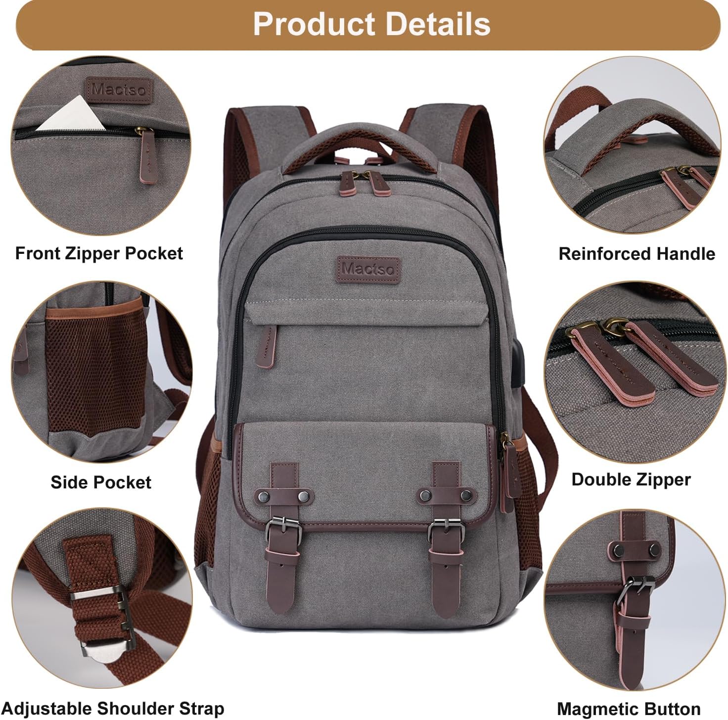 Mactso Canvas Travel Laptop Backpack for Men Women, Business Work Rucksack College Computer Bag Fits 17.3 Inch Notebook,Bookbag with USB Charging Port (Grey, 17.3 Inch)