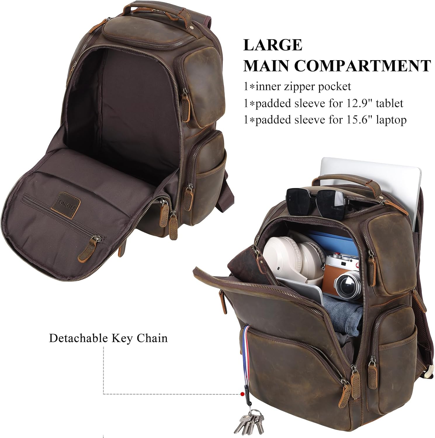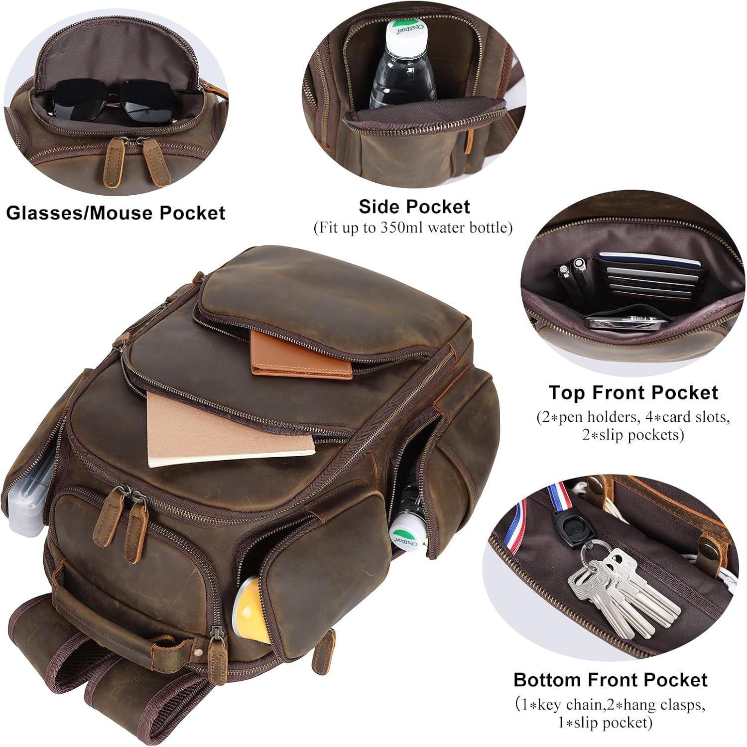 - 【Full Grain Cowhide Leather】The multi-pocket backpack is made of 2mm thick full grain leather, which can keep the natural texture of cowhide and greatly increase its durability. The distinguished feature of leather is the disordered scratches and color changes on the surface, giving a vintage look and uniqueness. Over time and use, leather looks better and gets a vintage effect