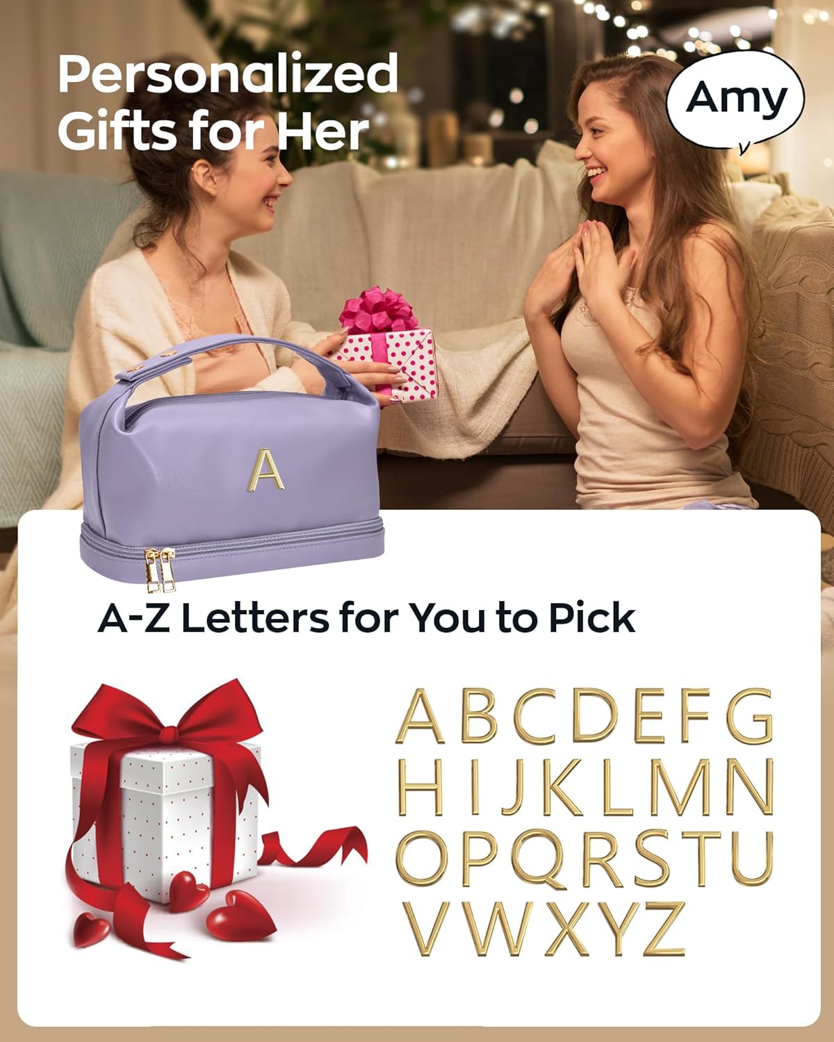 Personalized Makeup Bag with Handle, Initial Double Layer Cosmetic Bag with Makeup Brush Organizer,Gifts for Friends Female Mom