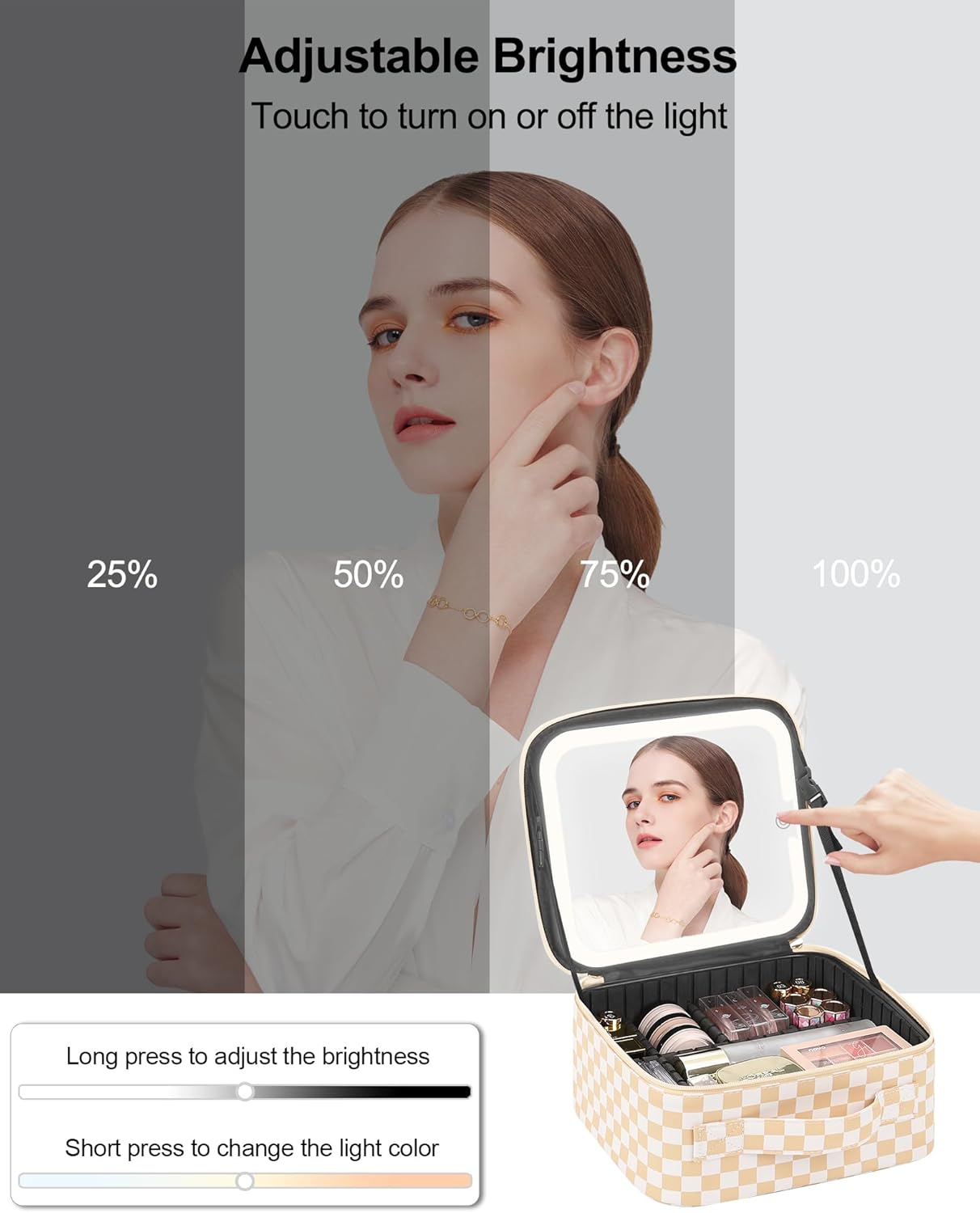 Chomeiu Makeup Bag with LED Mirror, Travel Makeup Case for Women and Makeup Artists Cosmetic Organizer Large Make Up Bags with Light Up Mirror, 3 Color Lights, Adjustable Dividers, Light Checkerboard