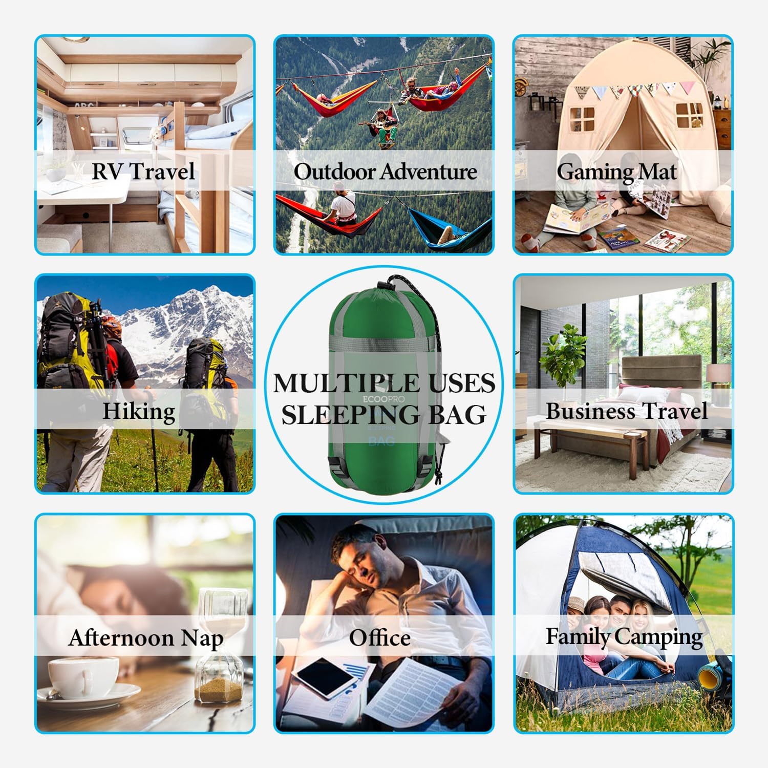 ECOOPRO Warm Weather Sleeping Bag - Portable, Waterproof, Compact Lightweight, Comfort with Compression Sack - Great for Outdoor Camping, Backpacking & Hiking-83 L x 30" W Fits Adults