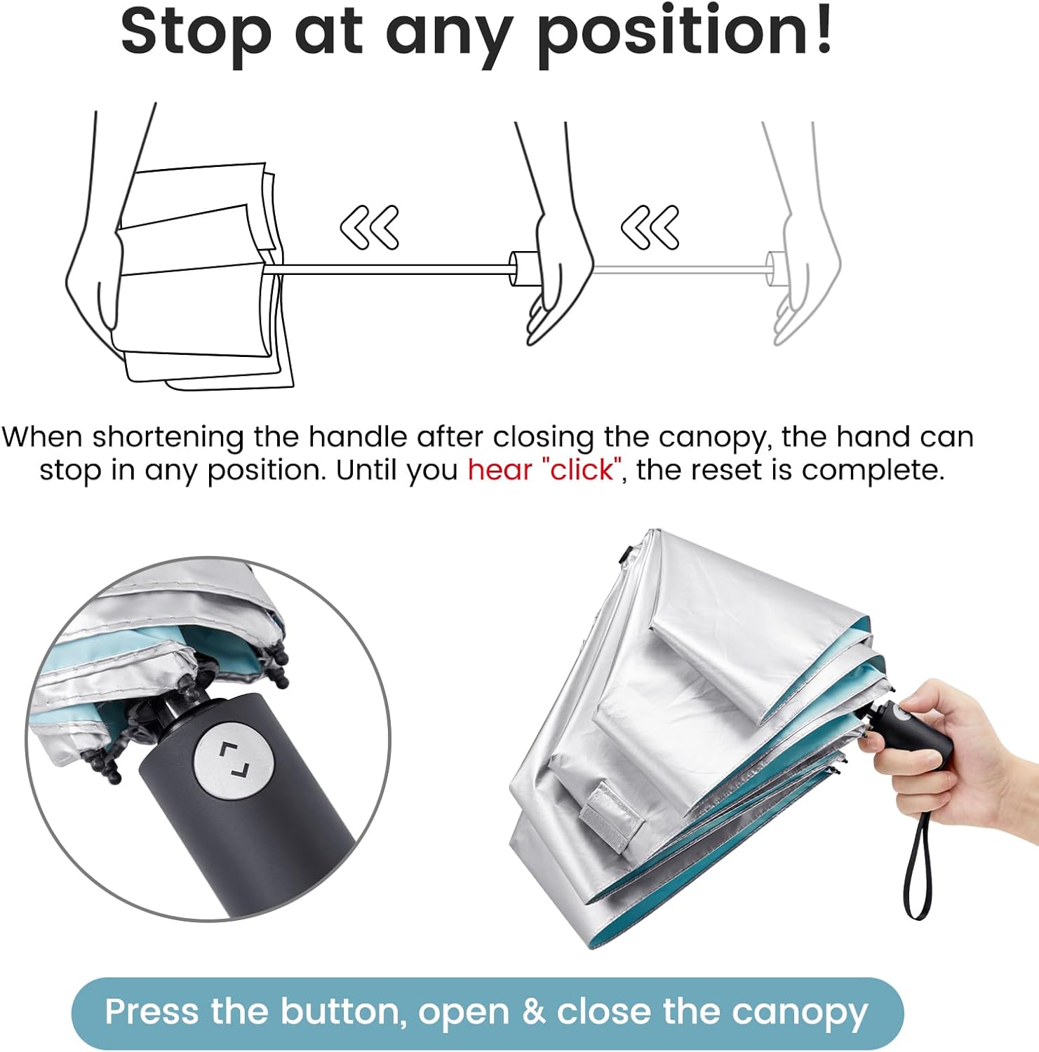 • 【Easy Automatic Open & Close With Safety Anti-rebound】The automatic umbrella can be operated with one hand. A special anti-bounce close function allows you to reset with very little pressure, and stop in any position without bouncing and hitting yourself. Remember to pull it back fully until you hear a click to complete the reset.
