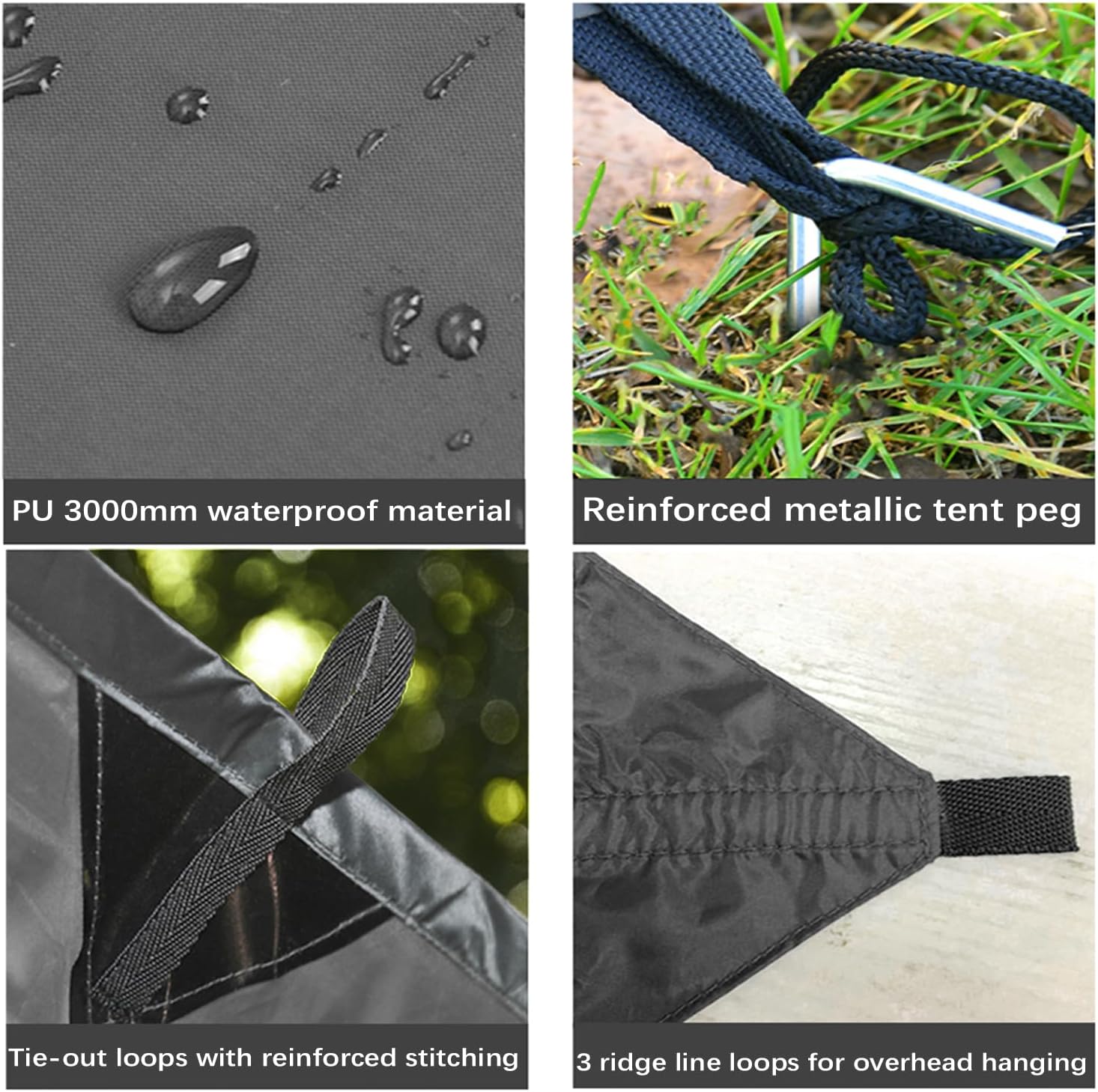 - [Waterproof & UV Protection]The waterproof tarp is made of high quality 210T Polyester with strong PU coating, weather-resistant.It can provide a safe shelter for you to escape from a sudden downpour and create dry hangout space for during a wet trip.