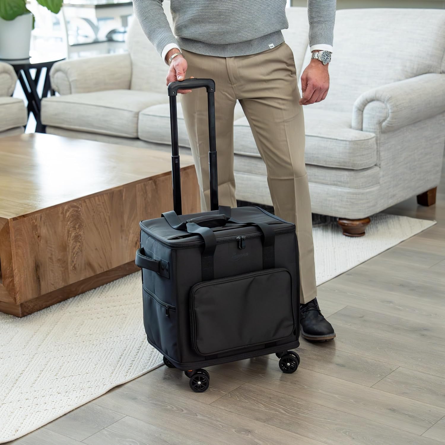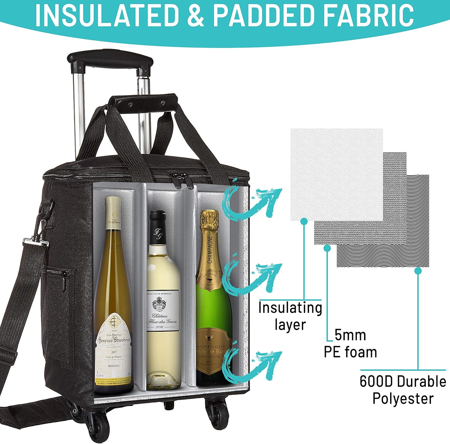 - TRANSPORT 50 LBS, NO HASSLE: This travel bag lets you safely AND conveniently take 12 bottles of wine, beer, champagne, and spirits anywhere you like. It has a versatile strap you can wear over your shoulder, two comfy handles you can connect like a wine tote, and a 41 inch telescoping handle with smooth 360Deg Castors, so you can effortlessly glide 50lbs of wine across hard floors and pavement.