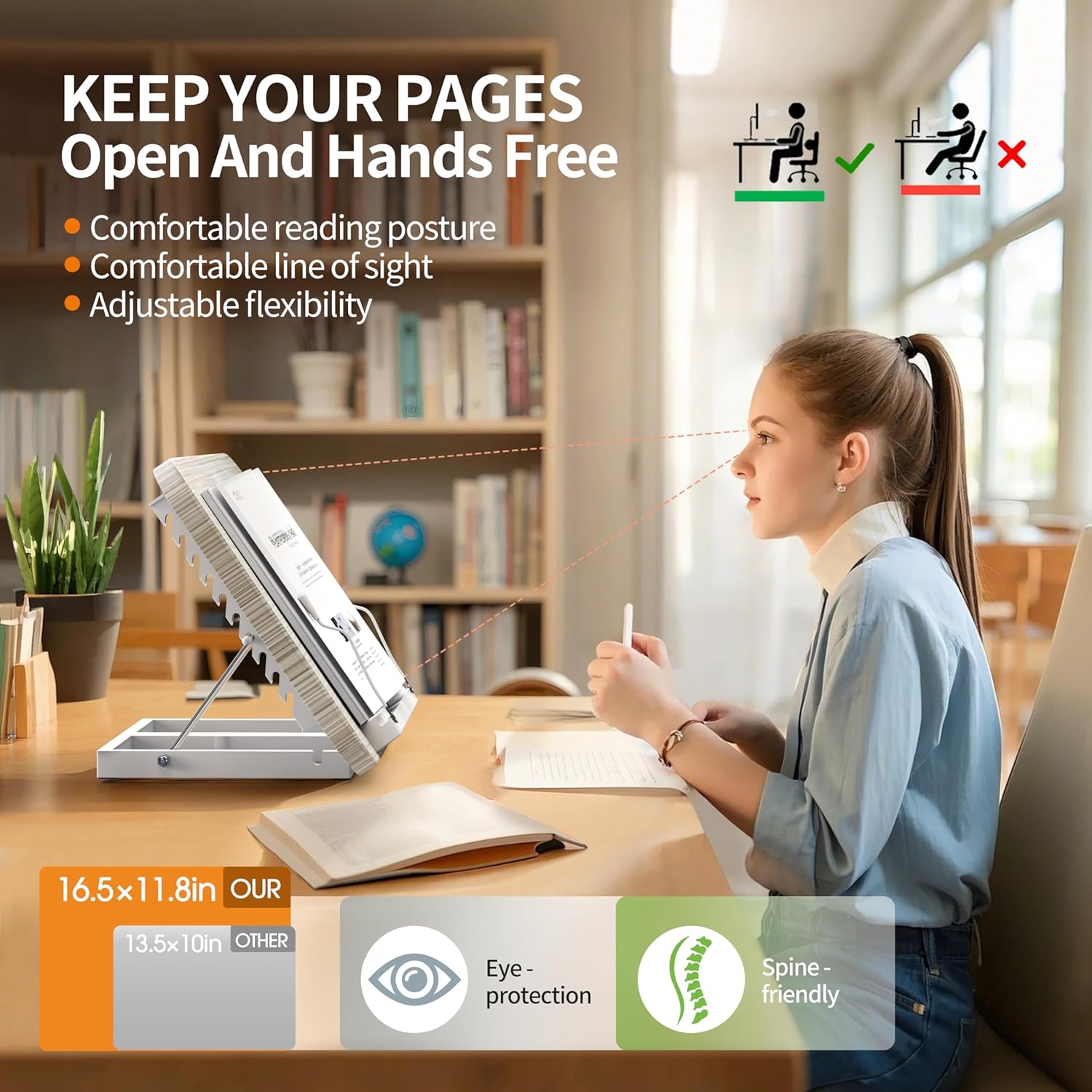 - Wooden Panel & Book Clip Design: The 0.5-inch thick wooden panel (16.5" x 11.8") offers more space than other standing laptop stands and supports a wider range of devices. The 2-inch raised edges effectively prevent laptops or books from slipping, ensuring stable placement. Additionally, the built-in book clip secures books or documents, freeing your hands and enhancing comfort
