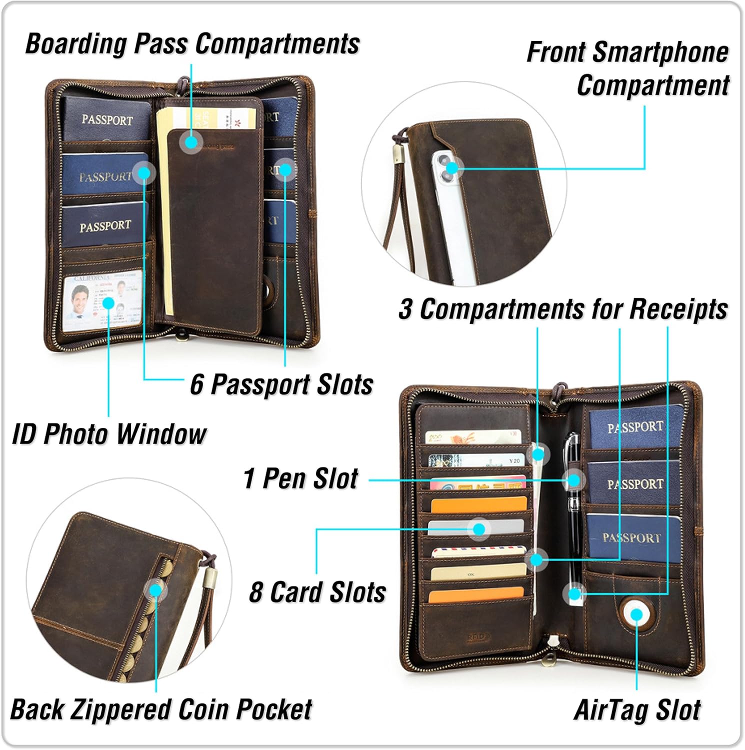 Top Grain Leather Travel Passport Wallet Organizer Case for Families, Handmade for 6 Passports & Multi Cards, RFID Blocking Large Capacity for Cards/Passports/Tickets/AirTag, Matte Coffee