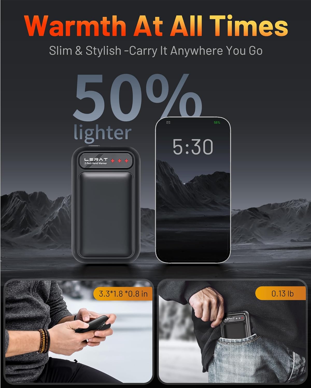 - 【Easy To Carry】 The rechargeable hand warmers are super slim and lightweight, measuring 3.26 inches and weighing only 0.18lb—just 30% of the weight of traditional models. The hand warmers are easy to carry and fits effortlessly into your pocket. Plus, it can be discreetly placed in hats, gloves, clothing, and tights for warmth wherever you need it.