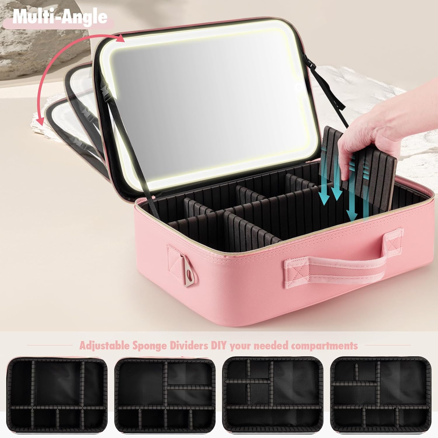 Large Travel Makeup Bag with LED Mirror, 3-Color Stepless Dimming Stand Mirror Detachable, with Adjustable Divider, Makeup Brush Holder Storage (Pink)