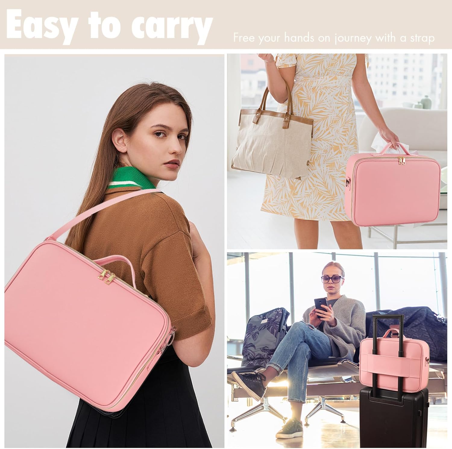 - 【HIGH QUALITY WATERPROOF AND STURDY MATERIAL】Our makeup train case is made of strong, dura ble, micro-textured, water-resistant PU material as well as high-quality metal zipper perfect closure, perfect for your cosmetic escort, without worrying about the powder cosmetics are damaged when travelling.It comes with a durable shoulder strap and luggage strap, suitable for multi-purpose scenarios, and can be used across the shoulder or inserted into luggage when traveling, as the back is designed with a thoughtful fixed wider insertion strap.