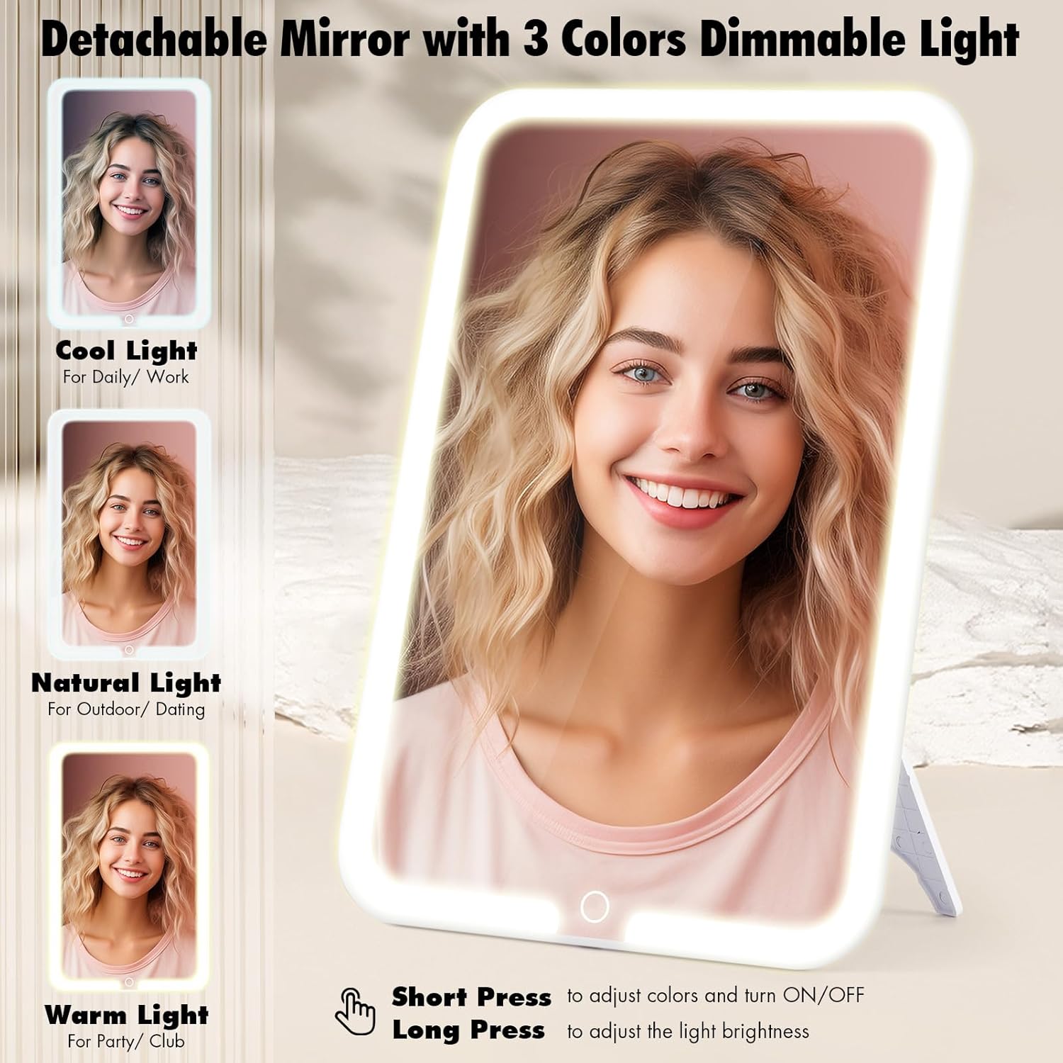 - 【HD DIMMABLE FULL-SCREEN MAKEUP MIRROR WITH LIGHTS】This Personal Item Makeup Bag is internally equipped with 3 Color lights full-screen detachable makeup mirrors for tabletop use or travel use, a rechargeable power cord with a commonly used type-c interface,Very friendly for elderly with poor eyesight.