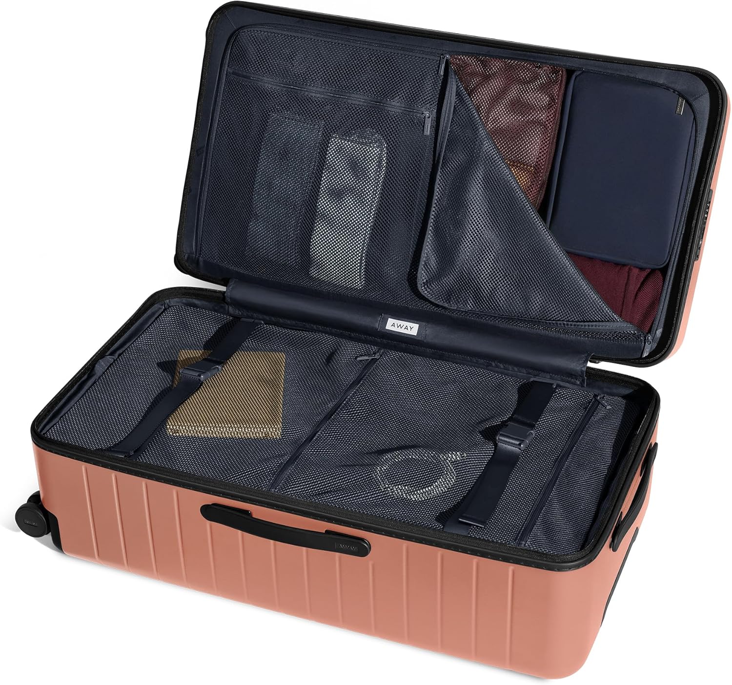 - Lightweight and durable design: Away’s Classic luggage is designed with a durable, water repellent, and lightweight 100% polycarbonate shell. Measuring 17"L x 13.7"W x 31.3"H (including wheels), this travel bag is prepared for long term travel.