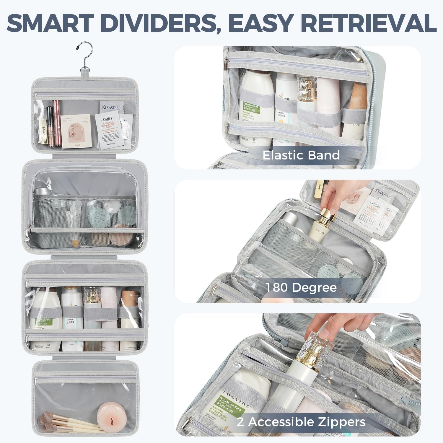 Toiletry Bag For women,Portable Hanging Organizer,4 Leakproof Compartment for full-sized Conditioner, Brushes Set, Makeup Accessories,Visible and easy to access.M-blue