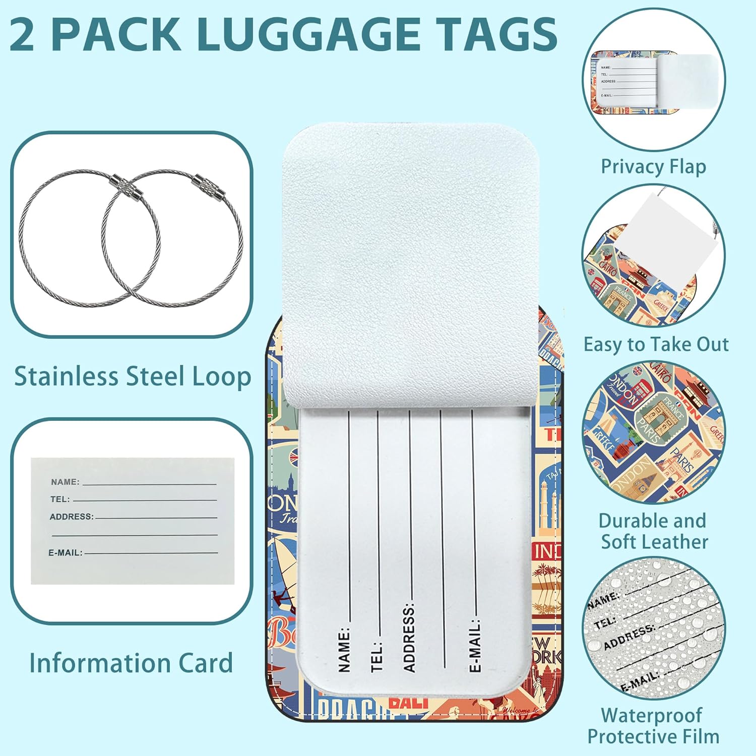 Travel Stamp Luggage Tag for Suitcase Set of 2 PU Leather Cute Luggage Tags with Stainless Metal Loop ID Label Privacy Flap Suitcase Tags for Women and Men Travel
