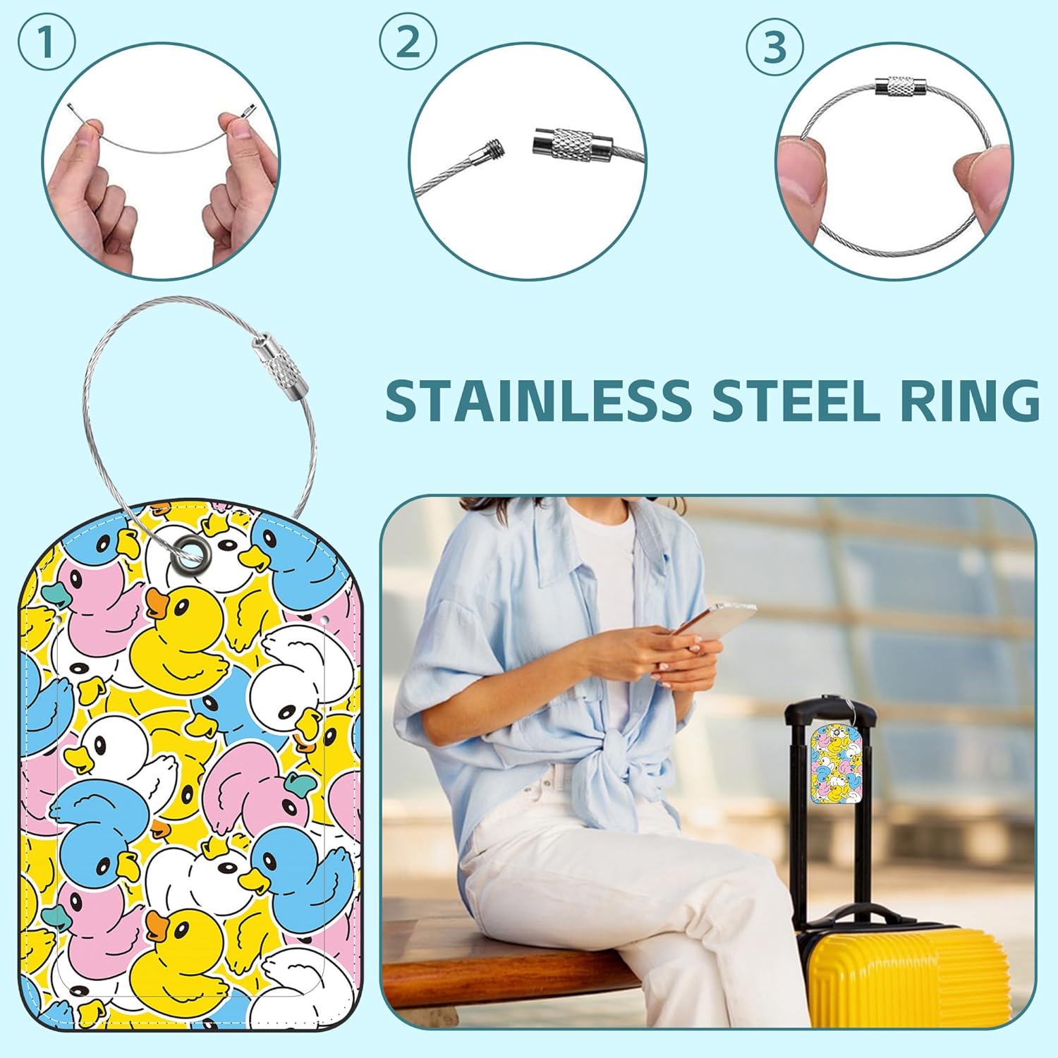 - Premium Quality:The luggage tag is made of PU leather,which is soft,durable and reusable.The detachable steel ring is made of stainless steel,which is sturdy and not easy to break.The color printing pattern of the baggage tag is colorful,clear,bright and eye-catching