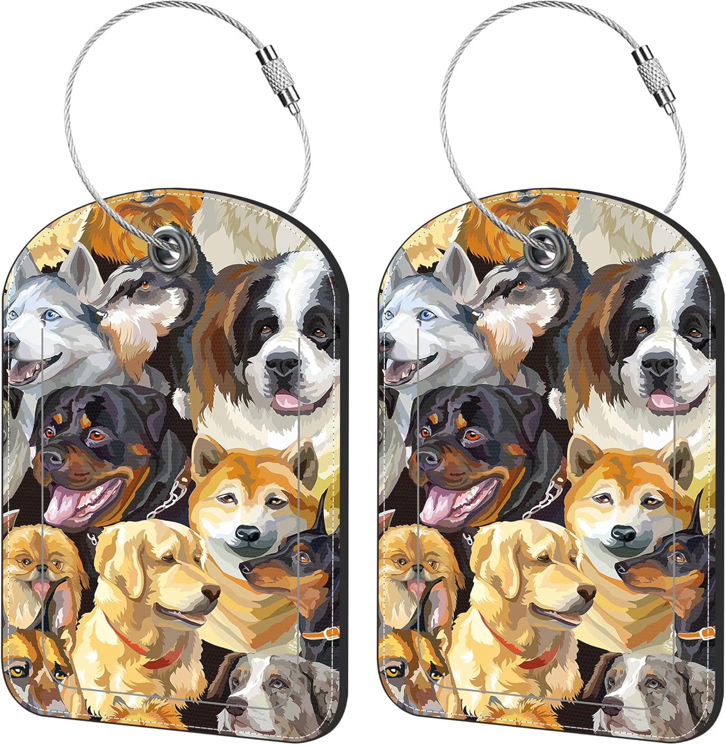 2 Pack Cute Luggage Tag for Suitcases Dogs Breeds Portraits Leather Luggage Tags with Stainless Steel Loop Privacy Flap Name Tags,Men and Women Travel Bag Suitcase Tags