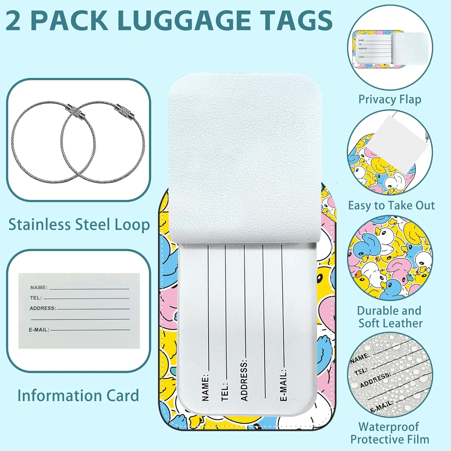Rubber Duck Luggage Tag for Suitcase Set of 2 PU Leather Cute Luggage Tags with Stainless Metal Loop ID Label Privacy Flap Suitcase Tags for Women and Men Travel