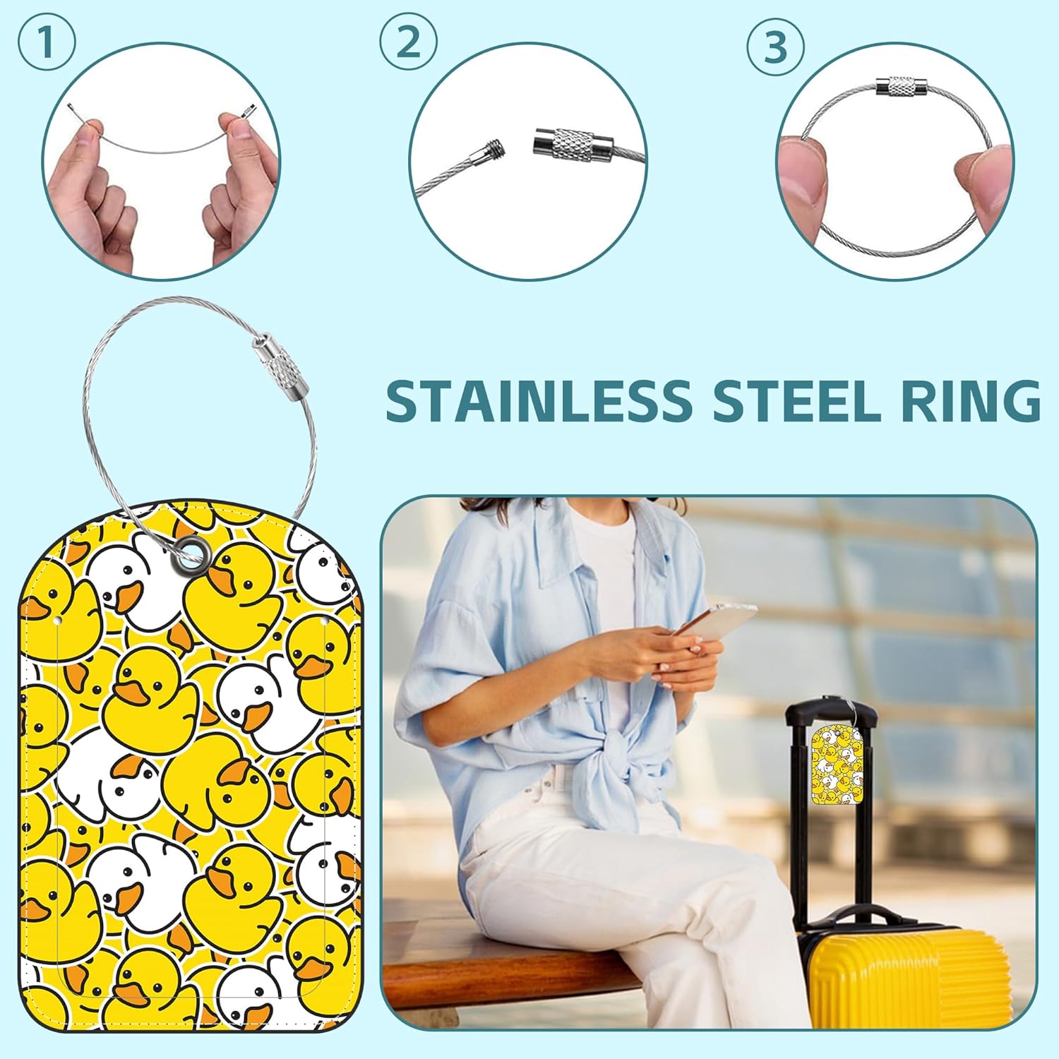 - Premium Quality:The luggage tag is made of PU leather,which is soft,durable and reusable.The detachable steel ring is made of stainless steel,which is sturdy and not easy to break.The color printing pattern of the baggage tag is colorful,clear,bright and eye-catching