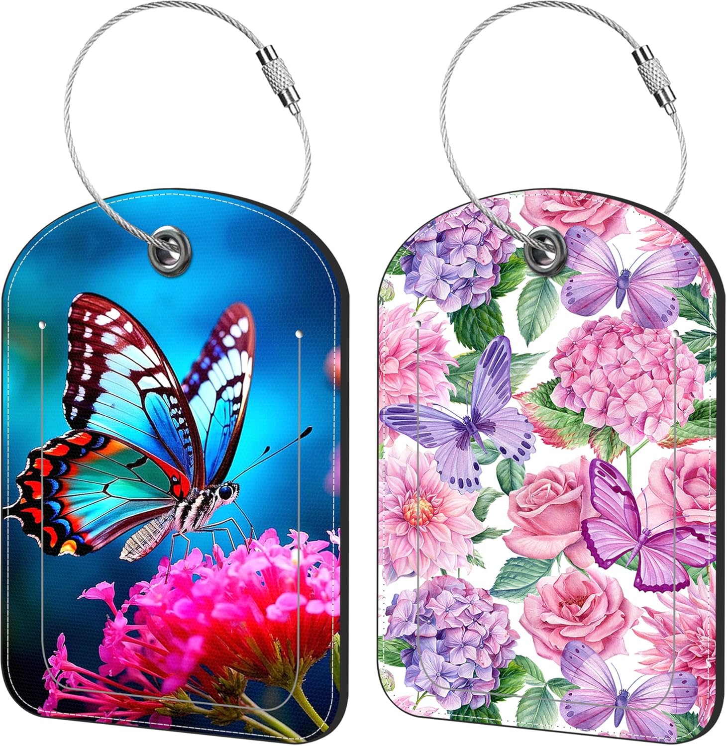 Beautiful Butterfly and Flowers Luggage Tag for Suitcase Set of 2 PU Leather Cute Luggage Tags with Stainless Metal Loop ID Label Privacy Flap Suitcase Tags for Women and Men Travel