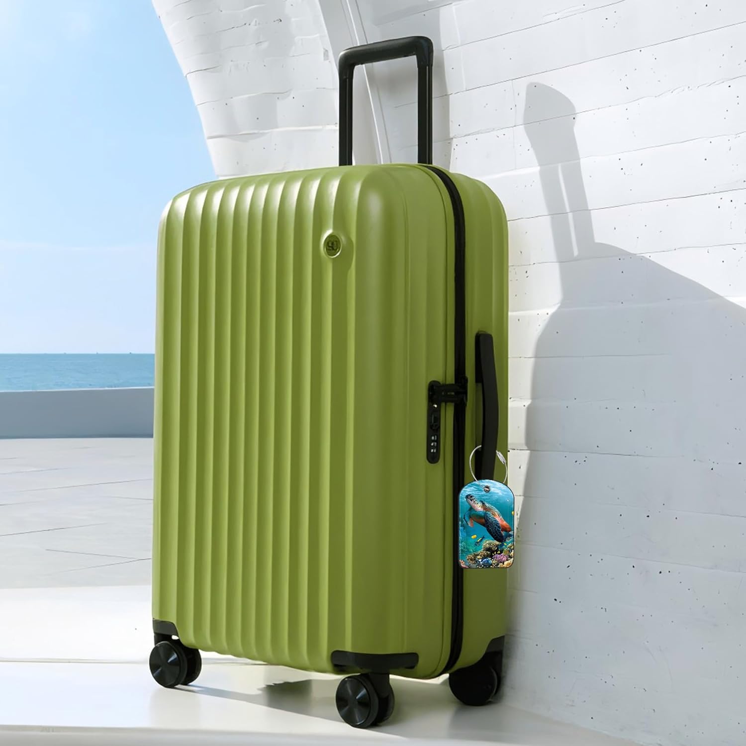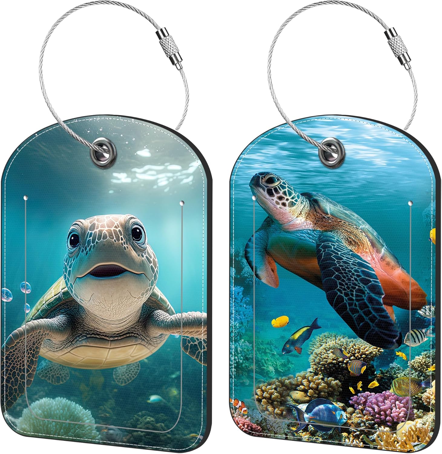 Hawaiian Sea Turtle Luggage Tag for Suitcase Set of 2 PU Leather Cute Luggage Tags with Stainless Metal Loop ID Label Privacy Flap Suitcase Tags for Women and Men Travel
