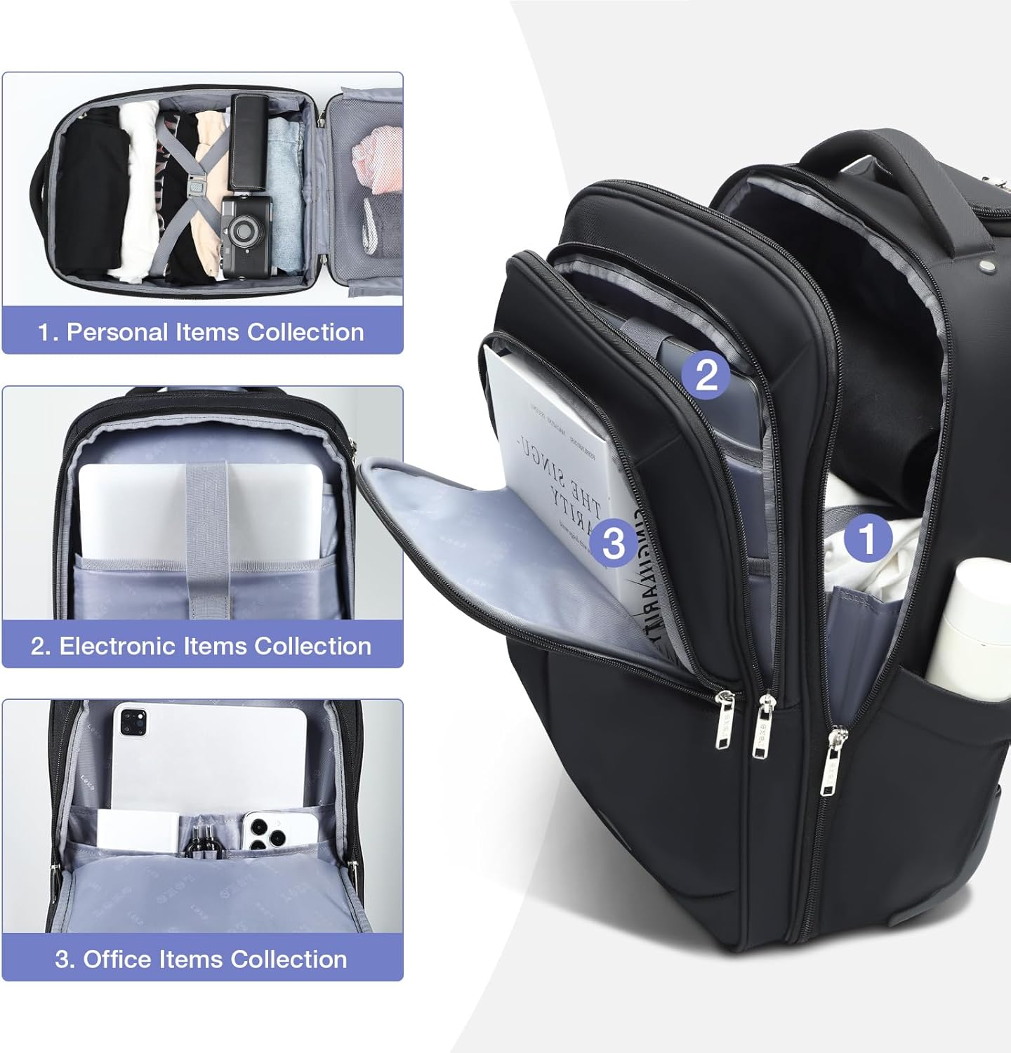 - [Large Capacity Rolling Backpacks] This rolling backpack Dimensions: 12.59 x 18.5 x 7.48 inches (L x H x W). The max volume of this wheeled backpack for adults is 37L with 3 seperate roomy compartment. The front compartment is for office items. The middle one is for electronic devices. And the biggest one is for your personal travelling items.Well organize your travlling items and make your travel easier.