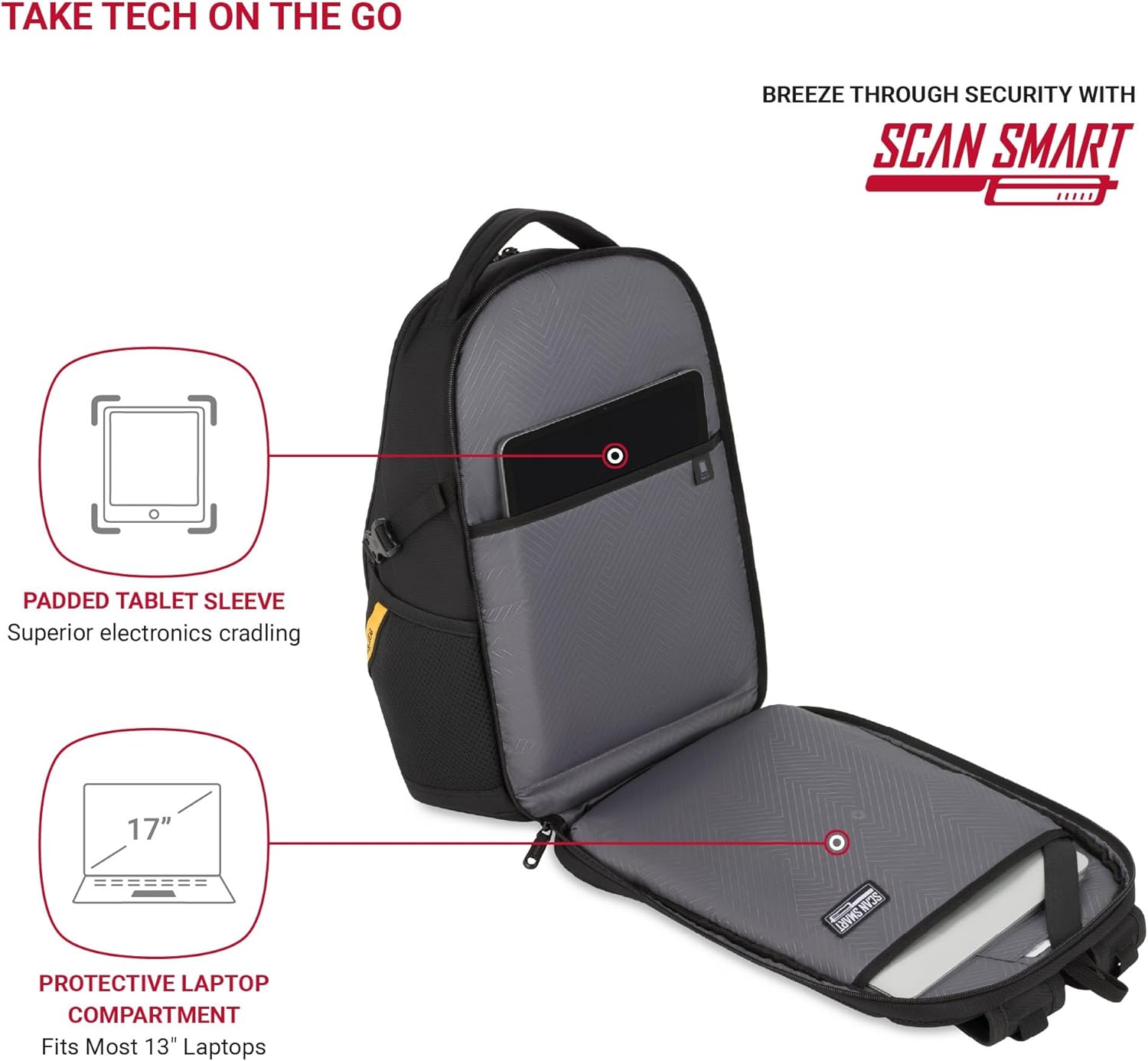 - SCANSMART TECH CAPABILITY: TSA-friendly, Lay-flat ScanSmart compartment with padded 13” laptop and tablet sleeves allow you to breeze through a security checkpoint hassle free.