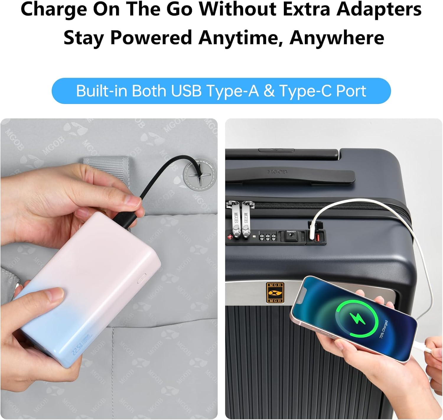 - On-the-Go USB-C/USB-A Charging Ports Stay 100% charged - This hard case luggage equiped with a dua head charging ports. Connect your power bank (not included) to dual ports, and get your electric devices charging while moving. Stay Powered Anytime, Anywhere, maximize your convenience.