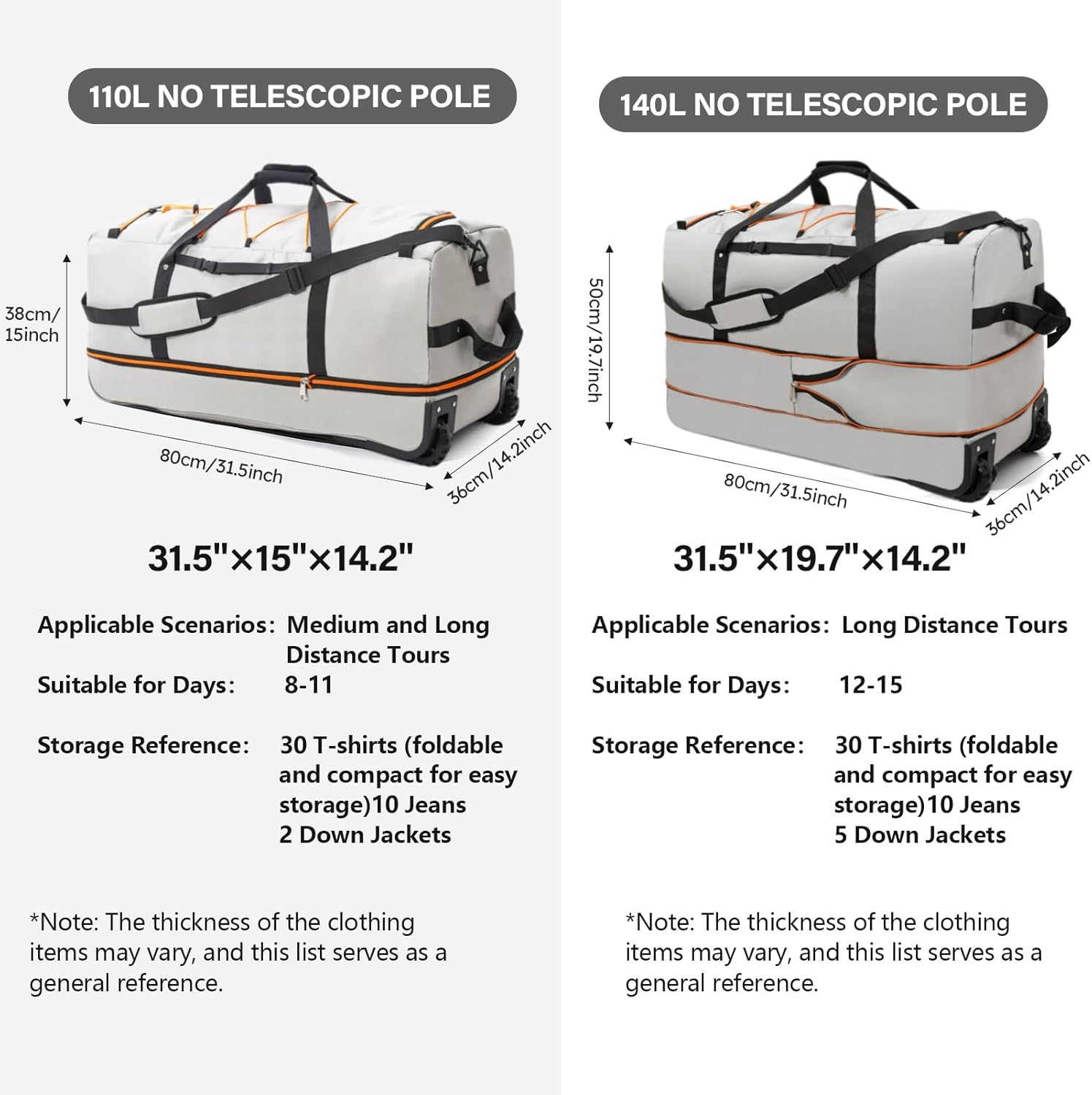 - Expandable Capacity: Switch from 110L (31.5"x14.2"x15") to 140L (31.5"x14.2"x19") for versatile packing