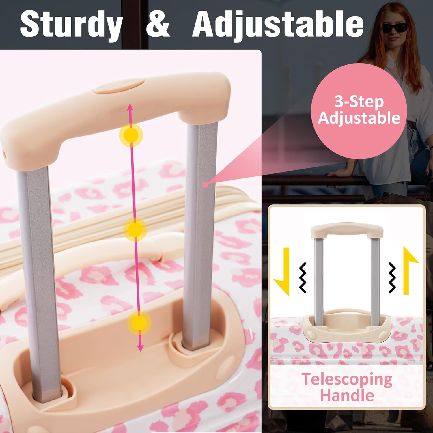 - Carry & Move:Silicone handles make it easier to lift your suitcases when going up and down stairs. Sturdy 3-step telescoping handle slso allow you to maneuver in tight spaces and provide effortless movement.