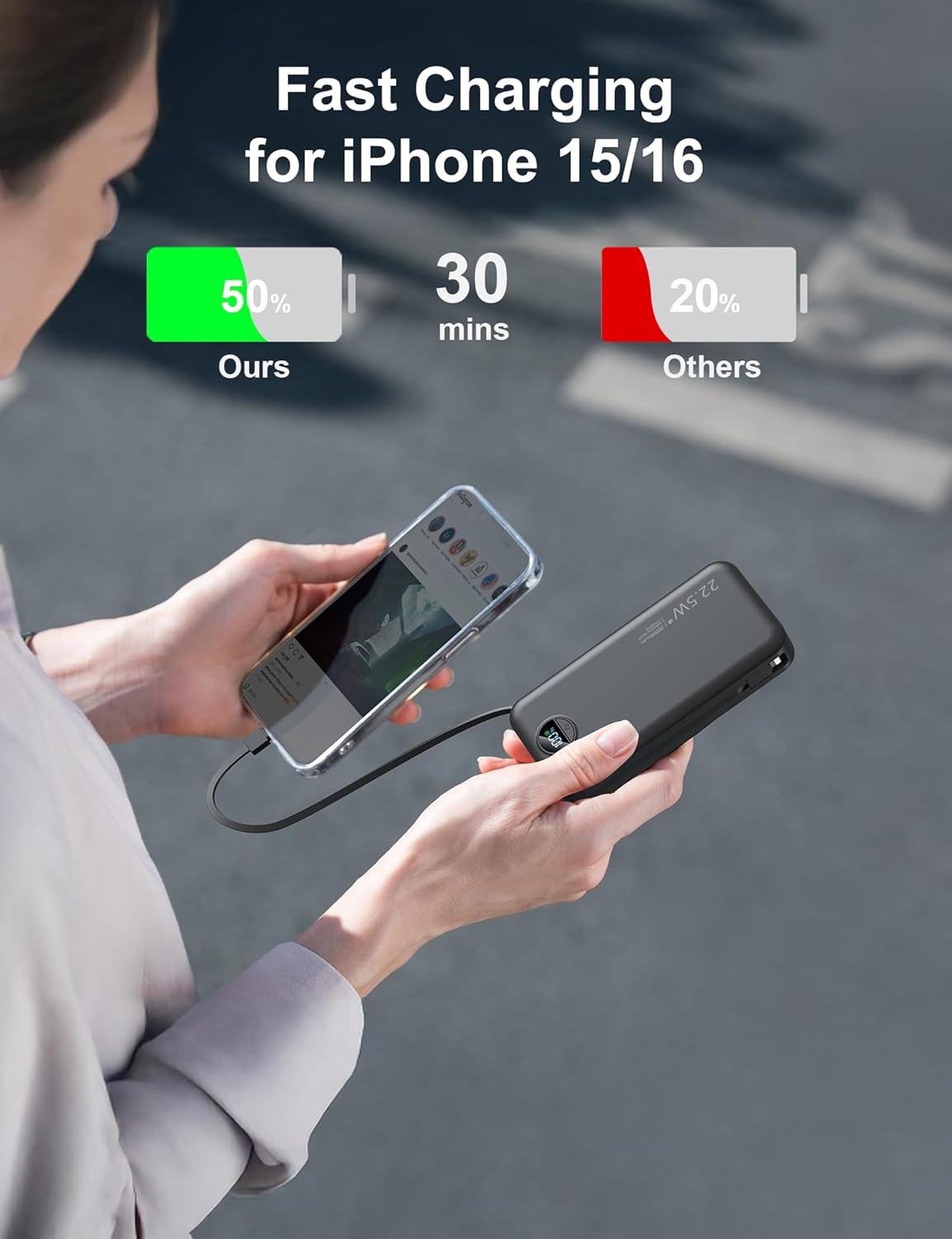 20000mAh Ultra-Portable-Charger-Power-Bank with Built in Cables&AC Wall Plug,PD20W USB-C Fast Charging Cell Phone Charger Battery Pack,LED Display Travel Battery Bank for All iPhone,Samsung,Android