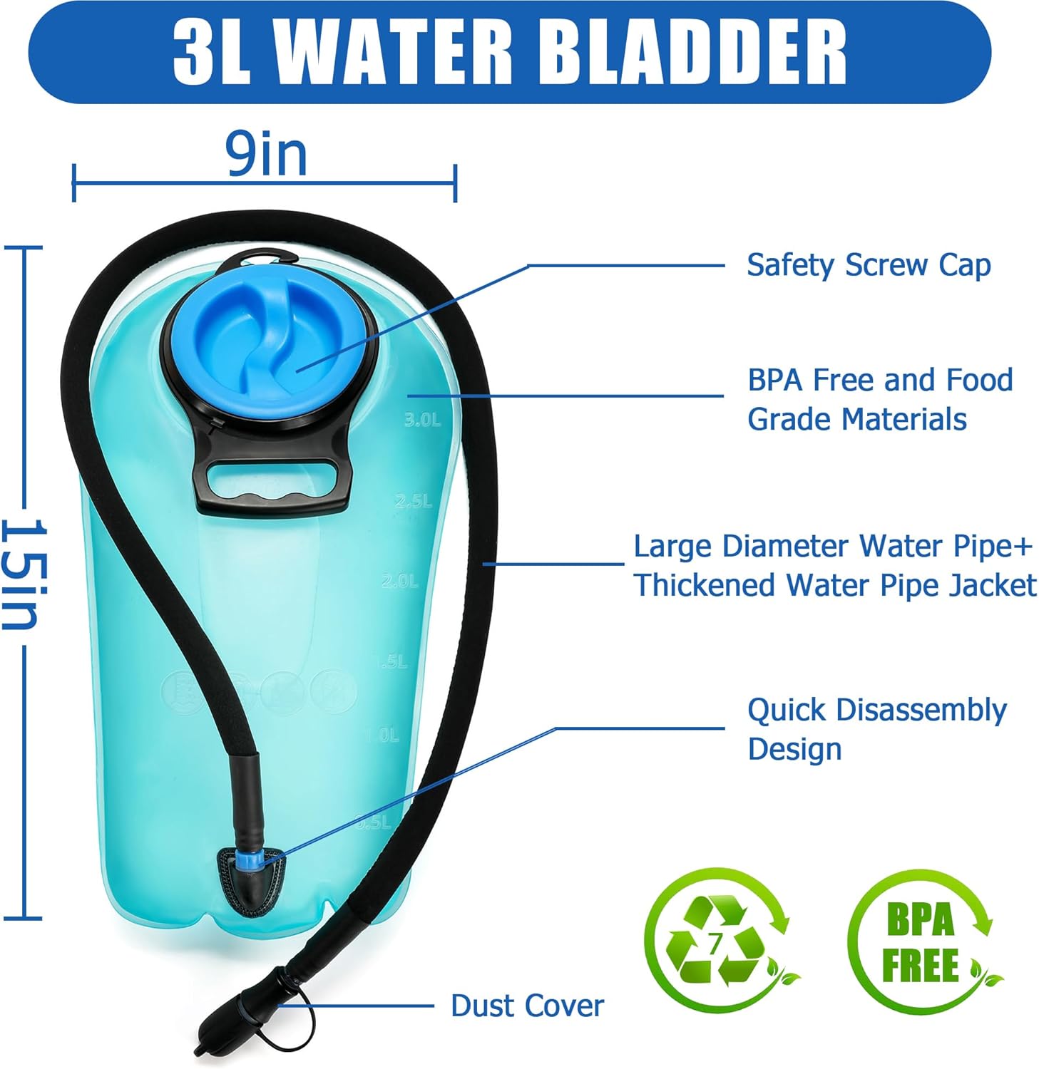 - Staying Hydrated at All Times: The water backpack is equipped with a 3L large capacity hydration bladder, and 3L of large capacity ensures enough water supply and is easy to use. the hydration bladder is made of food-grade BPA-free materials, which are safe and tasteless. After many tests, the hydration bladder is safe and leak-proof, and it is easy to replace
