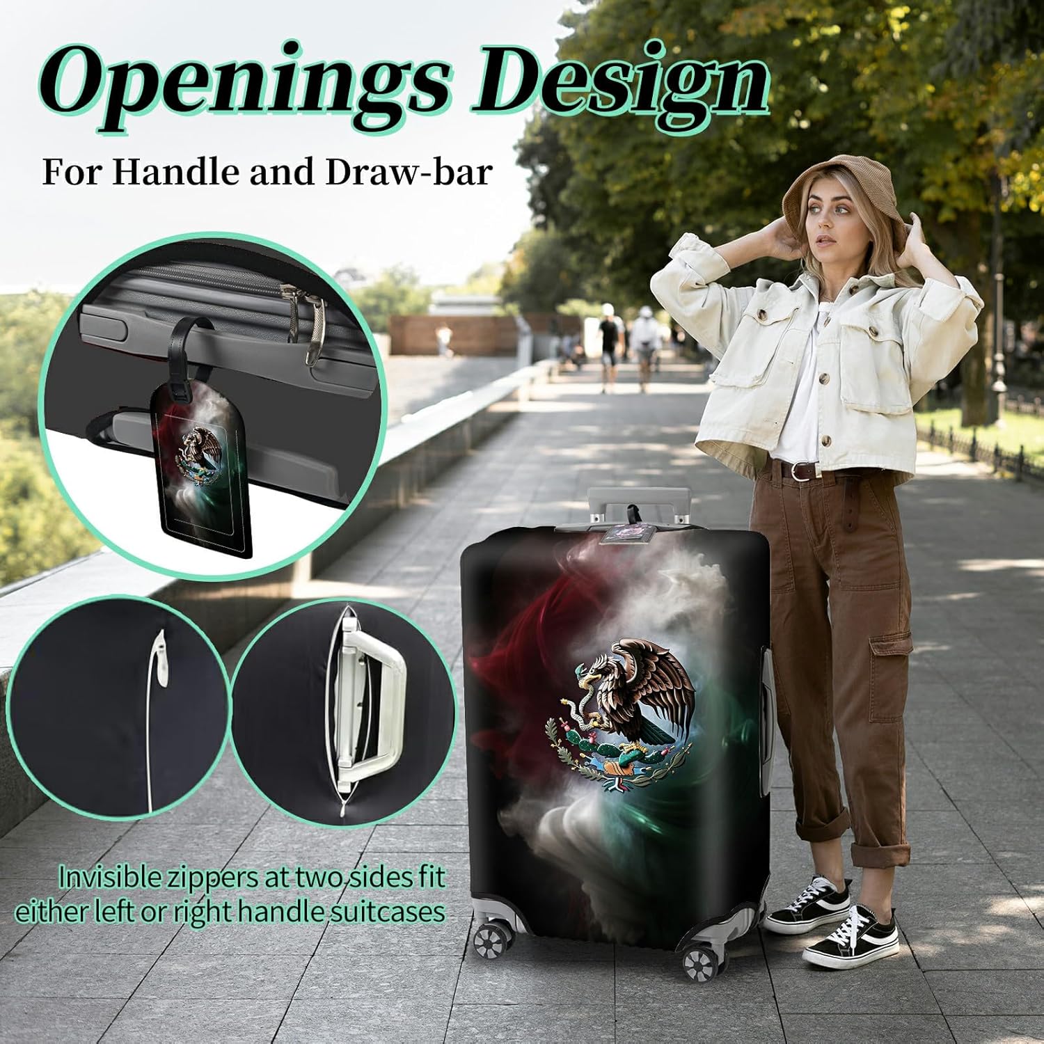 Luggage Cover + Tag, Mexican Flag Eagle Travel Suitcase Protector for 22-24 inch Luggage (M) with Concealed Zipper, Washable Elastic Cloth, Dustproof, Anti-Scratch