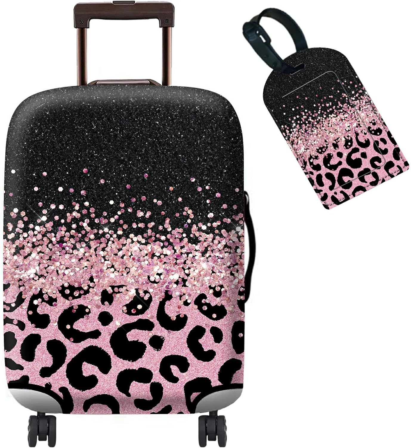 Luggage Cover + Tag, Pink Leopards Travel Suitcase Cover for 18-20 inch Luggage (S) with Concealed Zipper, Washable Elastic Cloth, Dustproof, Anti-Scratch