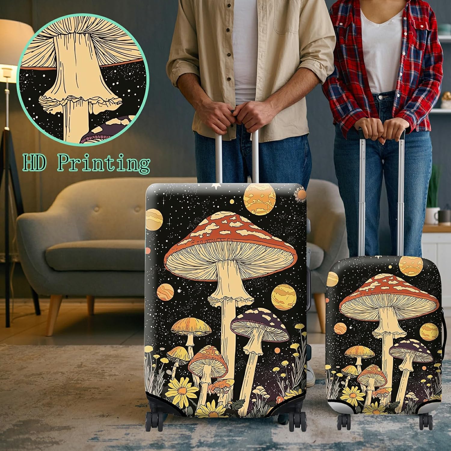 Luggage Cover + Tag, Mushrooms Travel Suitcase Protector for 18-20 inch Luggage (S) with Concealed Zipper, Washable Elastic Cloth, Dustproof, Anti-Scratch