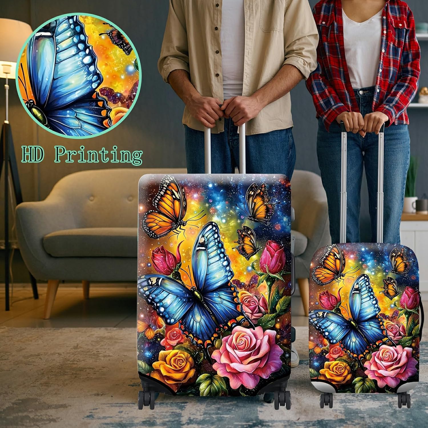 Luggage Cover + Tag, Colorful Rose Butterfly Travel Suitcase Cover for 18-20 inch Luggage (S) with Concealed Zipper, Washable Elastic Cloth, Dustproof, Anti-Scratch