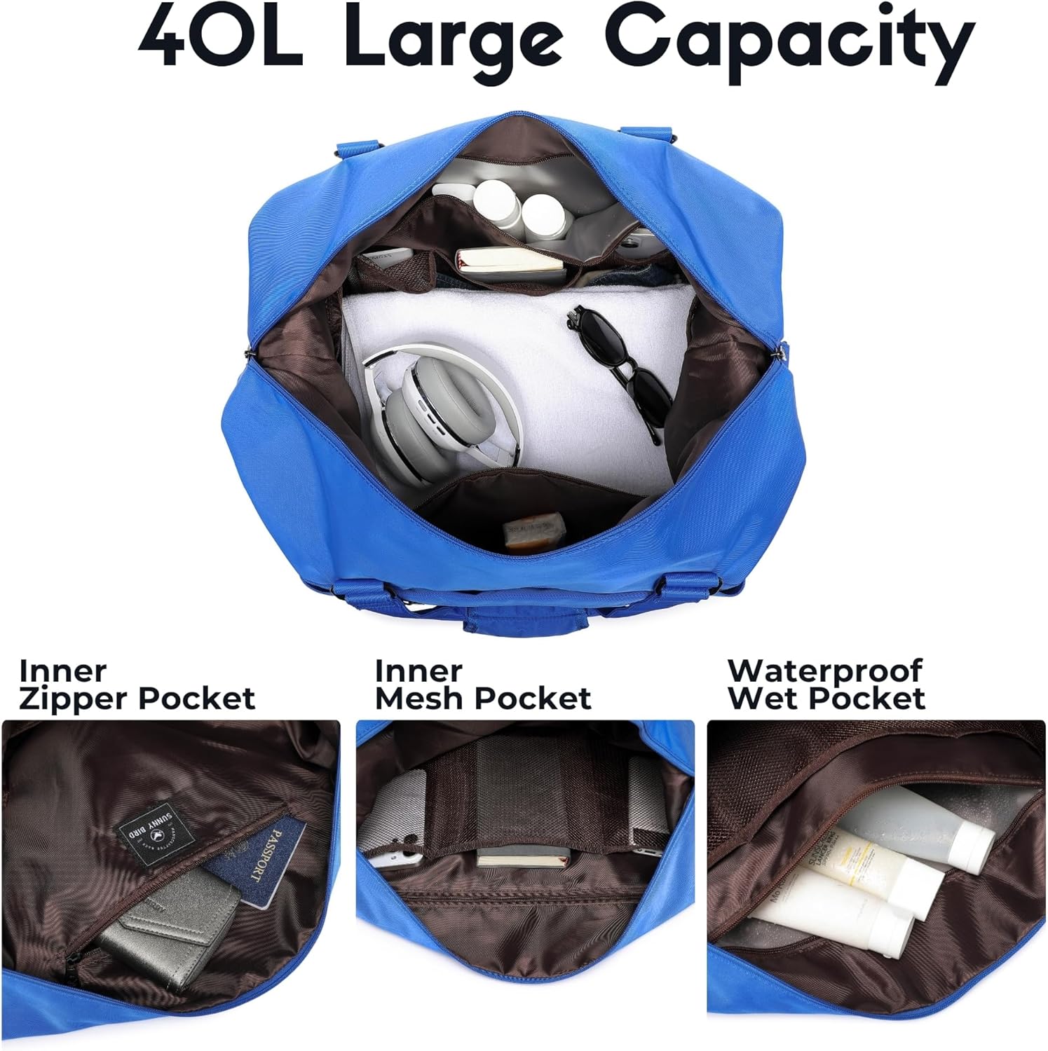 SUNNY BIRD Duffel with Utility Pouch, 40L Weekender Overnight Bag with Shoe Compartment for Travel and Sports (Blue)