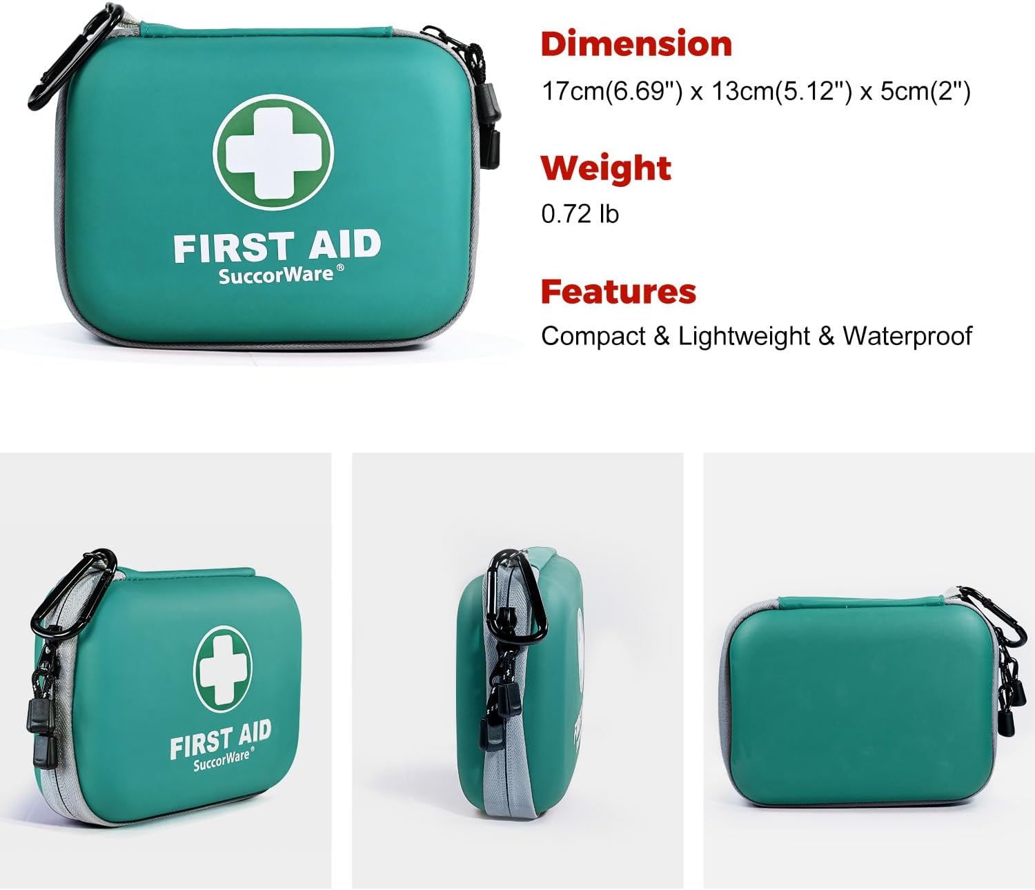 - SMALL AND LIGHTWEIGHT - Small first aid kit measures 17cm x 13cm x 5cm (6.69“ x 5.12” x 2") and weighs only 0.72 lbs (326.8g). The right size is perfect for carrying around such as hanging on a backpack, putting it on a car or boat in case of emergency.