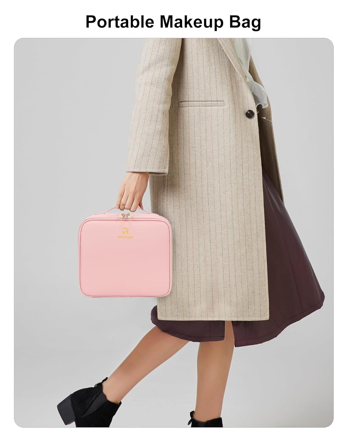 Relavel Makeup Bag with LED Mirror, Small Travel Makeup Case with Rechargeable Lighted Mirror 3 Color Lights, Double Layer Cosmetic Box Makeup Brush Lipstick Holder Organizer for Women, Pink
