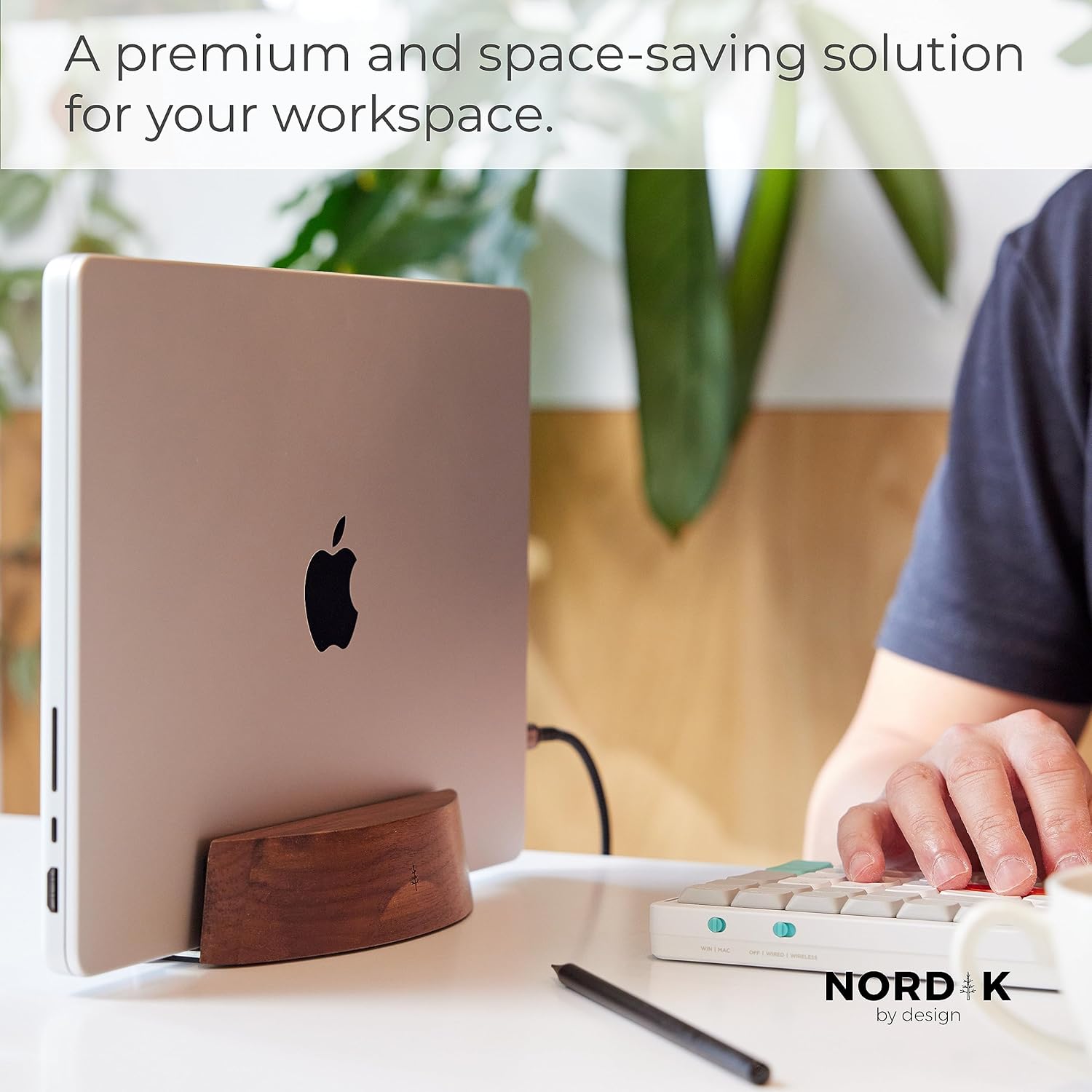 Nordik Adjustable Vertical Laptop Stand - Walnut - Premium Laptop Holder for Home Office, Software Engineers - Space Saving Desk Laptop Dock - Stable Non-Slip Wood Stand - MacBook Pro