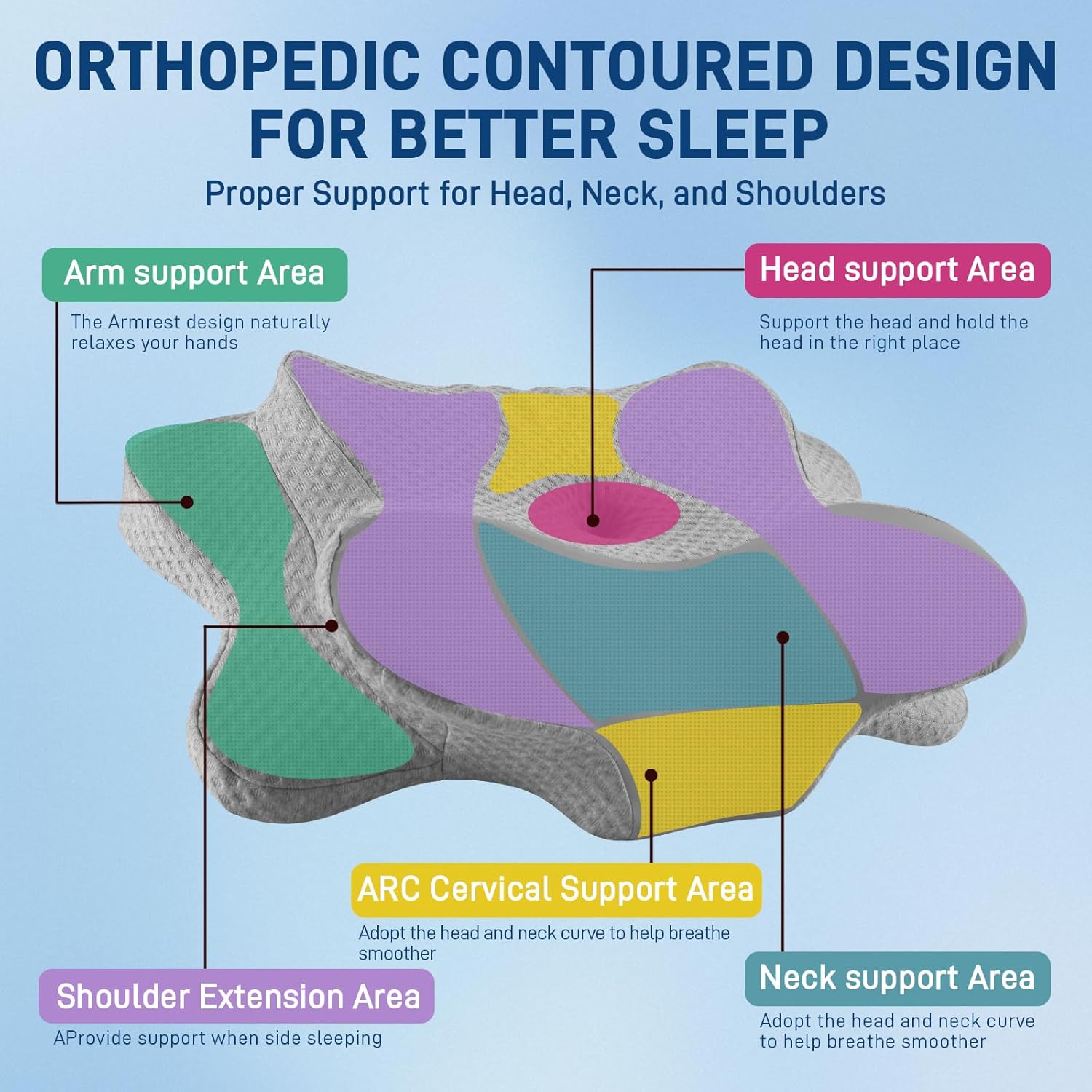 - Adaptive Contour Pillows for All Sleeper: Our ergonomic contour neck pillow are made to provide pain relief for all sleeping styles. Whether you sleep on your back, side, or stomach, the shape of our neck support pillow allowing the cervical spine to be more efficiently supported, stretched and relaxed, thus releasing physical tension even neck pain