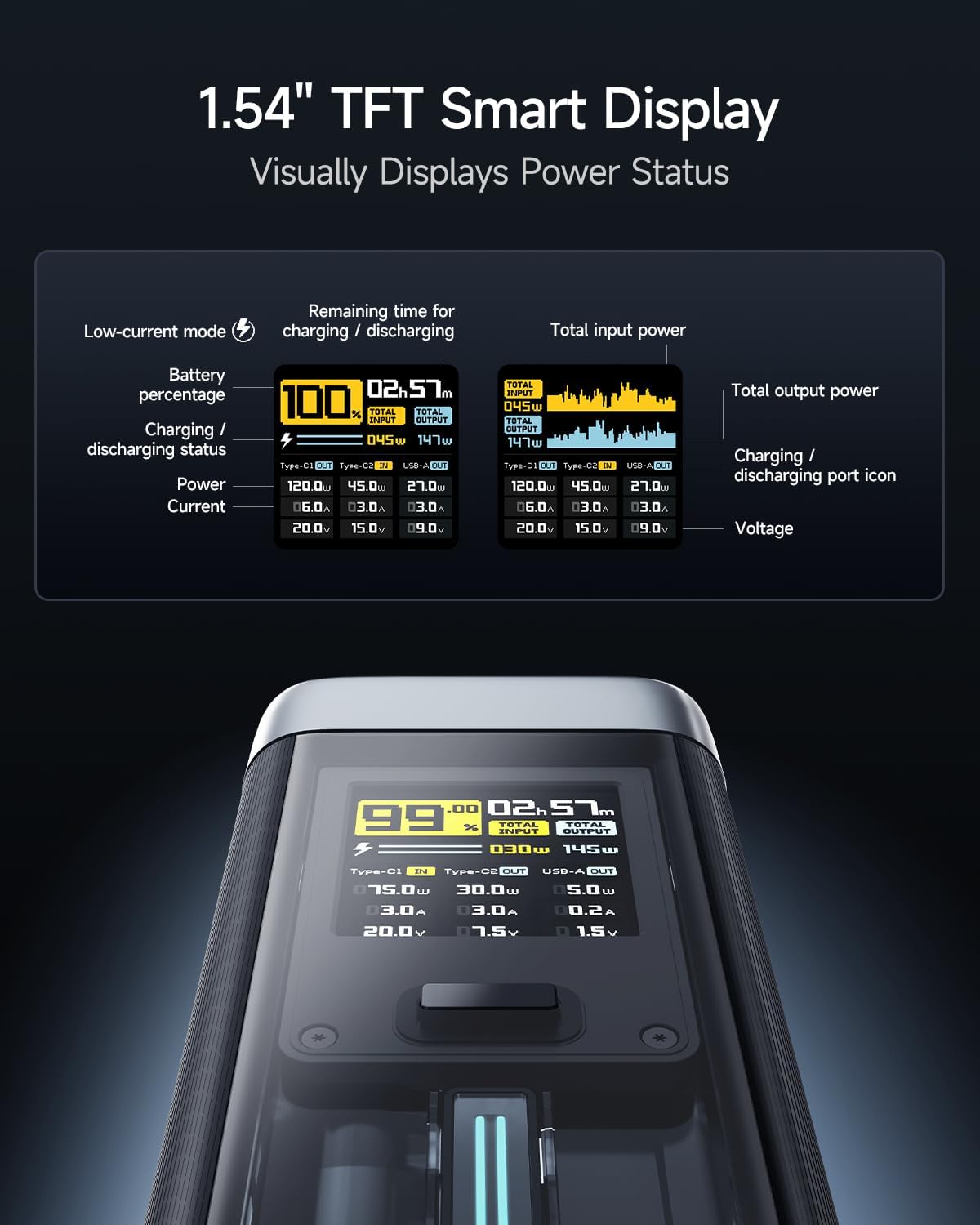 - Smart TFT Display: Featuring an intuitive TFT display, it keeps you informed with real-time info like battery level, power, voltage, and current. Stay in control and stay engaged with your power bank. The graphical display makes understanding its status a breeze.