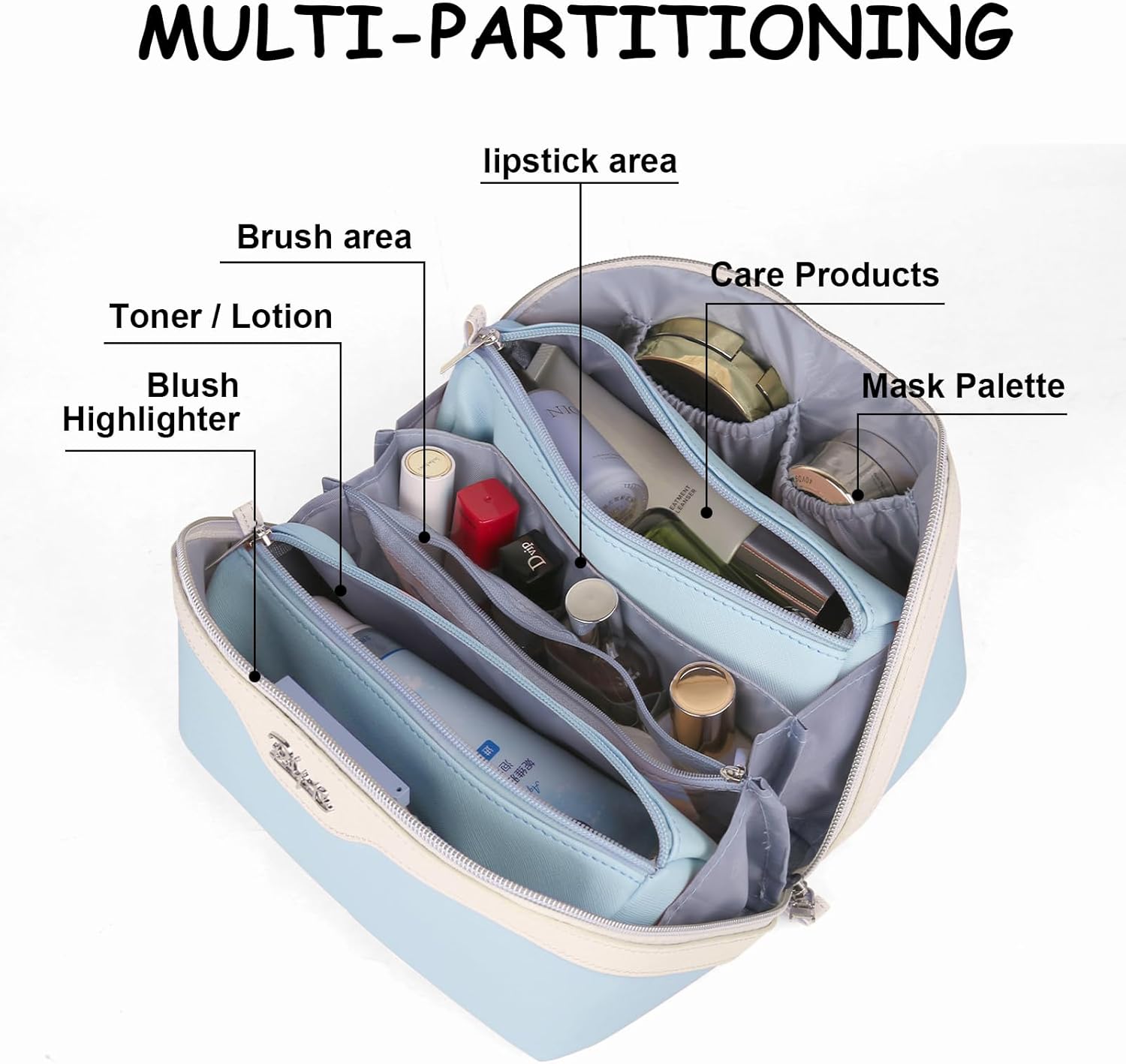 - With Five compartments & Large Capacity & lightweight: Enough room to keep your toiletries, skincare products and cosmetics. Measuring 9.25*5.1*5 inches in size, fit for 230ml toner or even larger bottles. What's more, It is a lightweight makeup bag with large capacity, just weight 0.75 LB. It is easy to hold your cosmetics and toiletries, can be used as a travel toiletry bag, preppy makeup bag, bathroom bag, cosmetic case, etc.