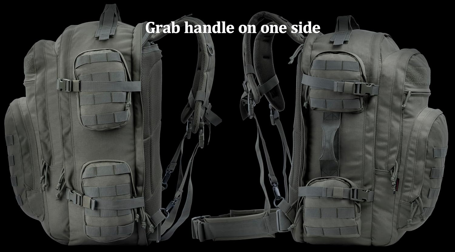 - Reinforced grab handle on top and left side for grab and quick move. Hydration tube port built on each side. MOLLE webbing on front and side pockets for expanding attachments. 4 D rings built on shoulder straps for attaching small gear.