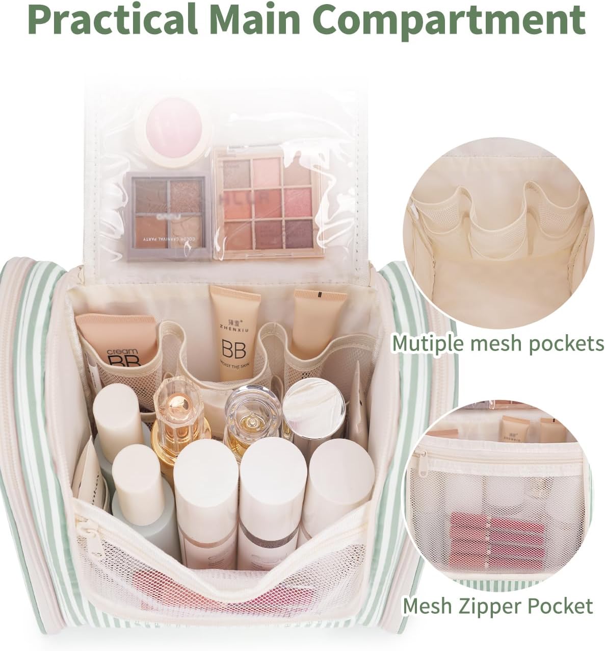 Narwey Striped Hanging Travel Toiletry Bag for Women, Travel Bag for Toiletries, Makeup Bag Organizer Cosmetic Bags Make Up Bags for Women (Mint Green Stripe)