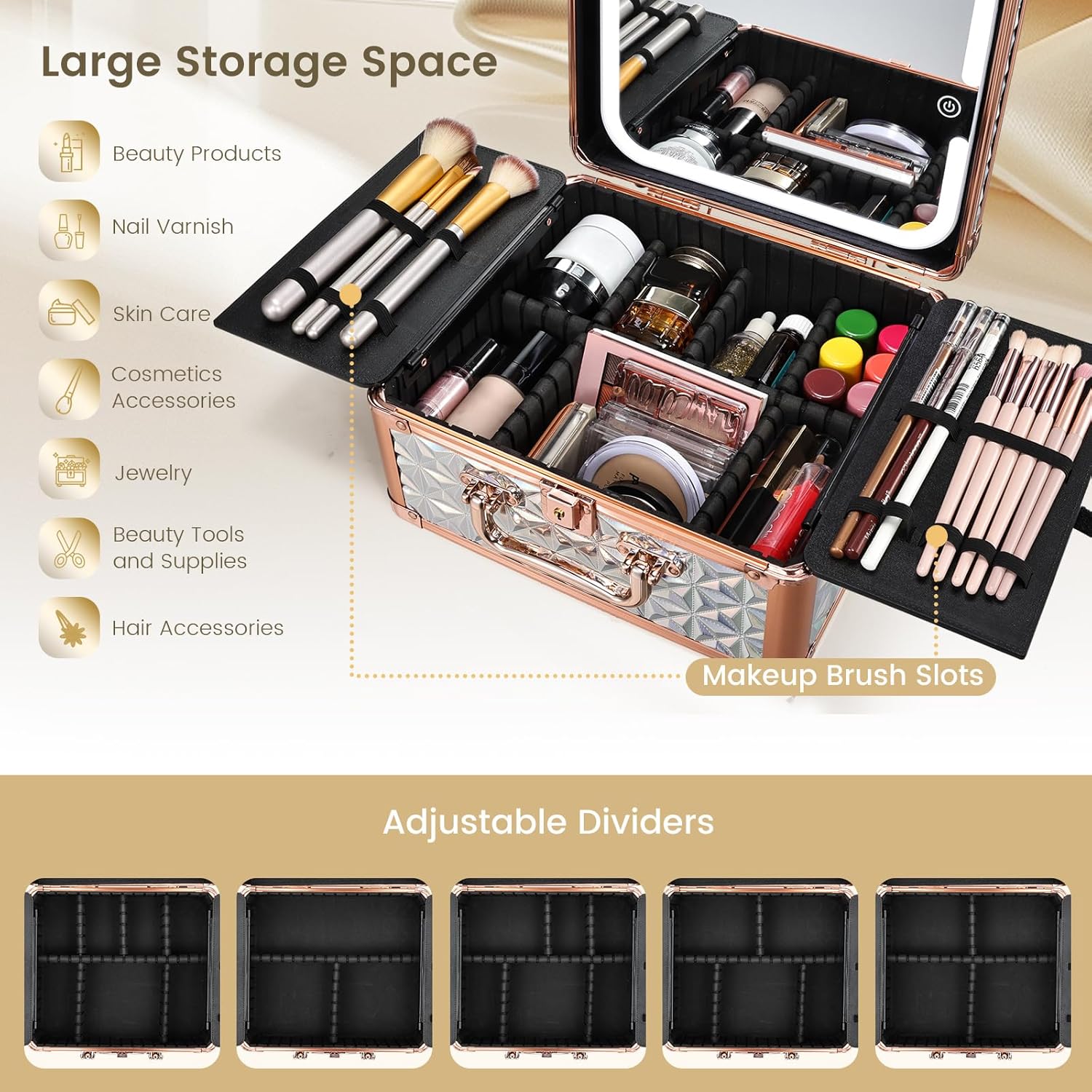 - 【3 COLOR FILL LIGHT MIRROR MAKEUP CASE】- Makeup case with a smart full-screen illuminated mirror that can be independently removed for use. The mirror features a 360° swivel bracket and can tilt at angles of 30°, 60°, and 90°, making it perfect for use on a desk. A gentle touch of the switch allows for effortless adjustment between cold, neutral, and warm color temperatures, while a long press can vary the brightness from 0% to 100%.