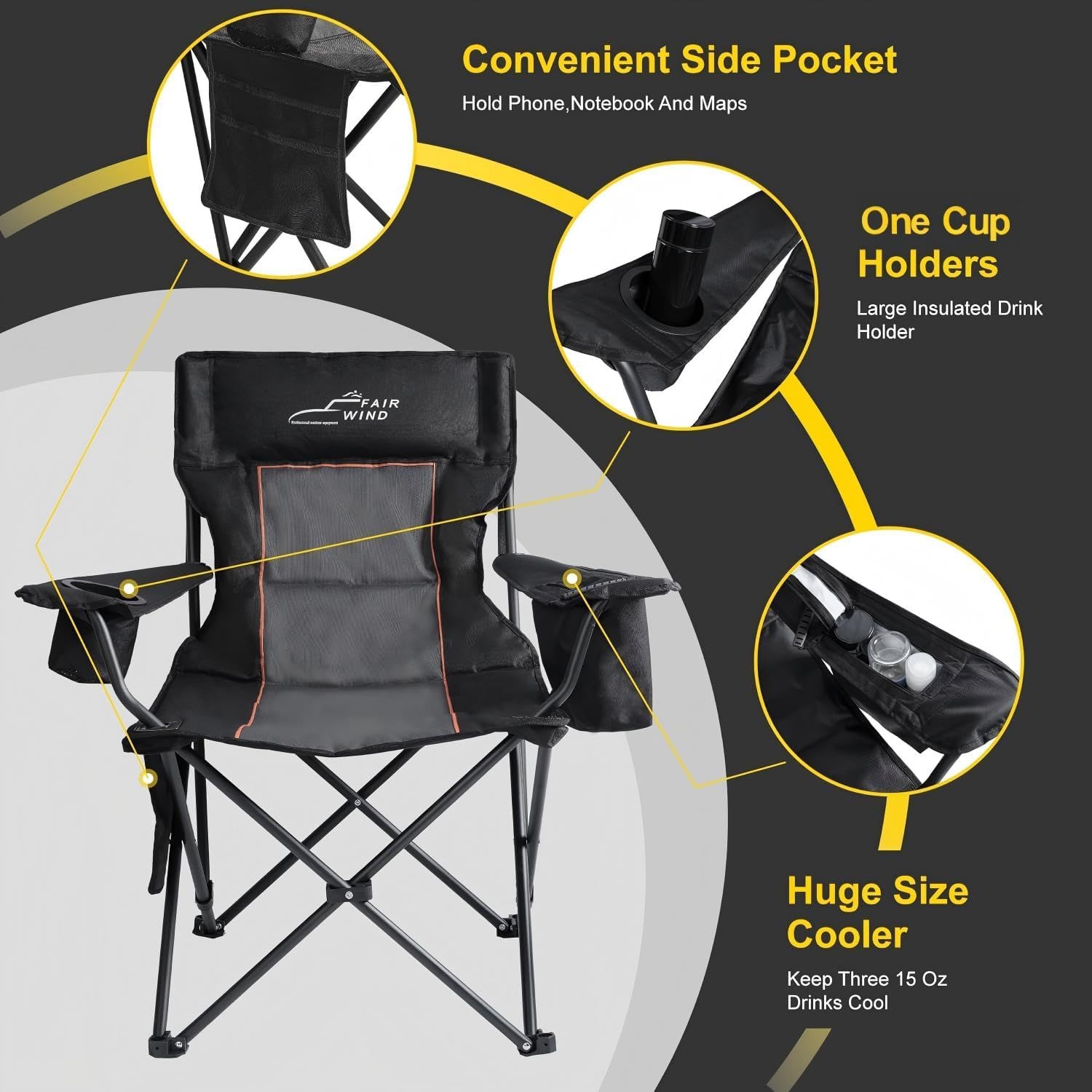 FAIR WIND Oversized Padded Camping Chair with Footrest Stool Set Heavy Duty Support 300 LBS Cooler Bag Chair - Black