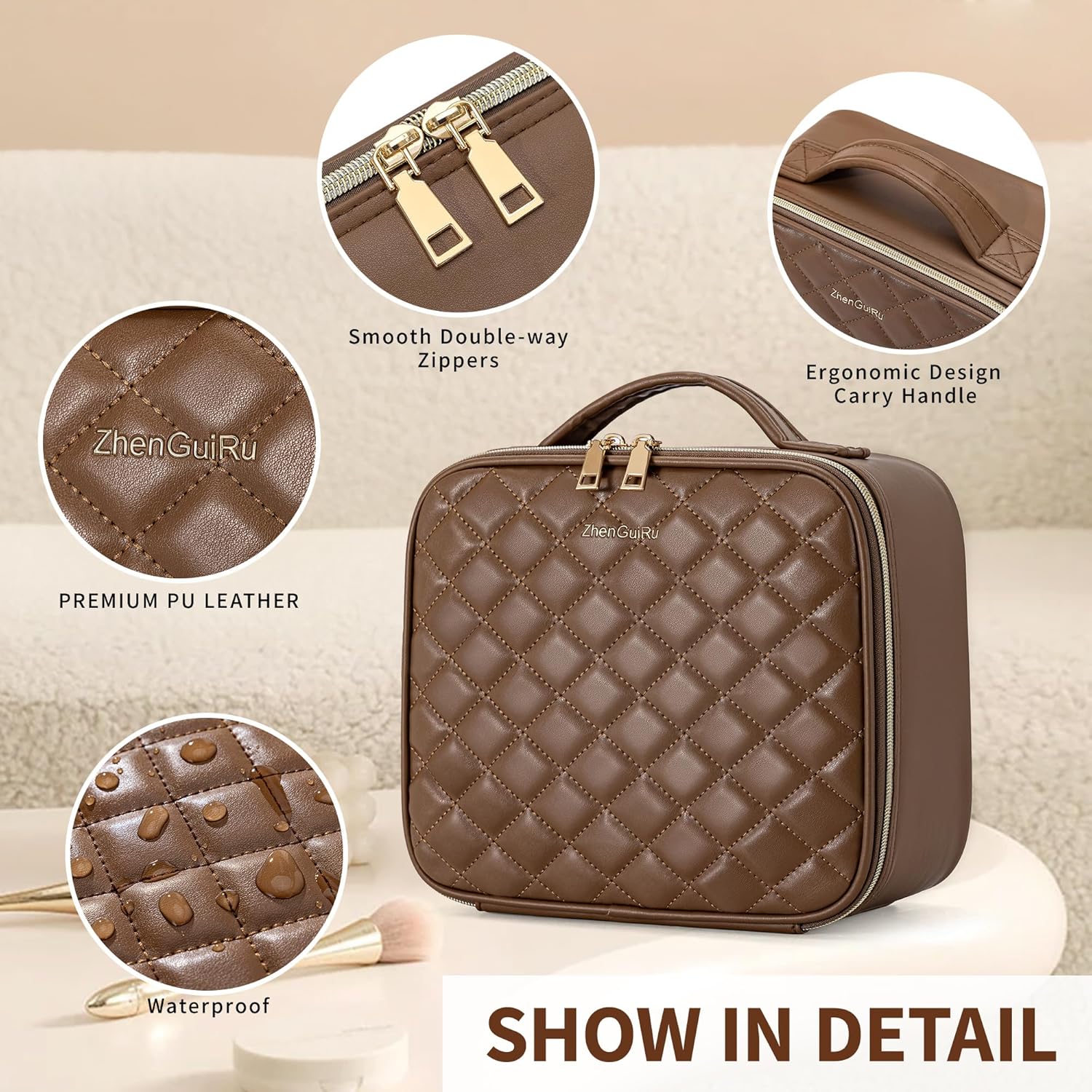• 【Premium PU Leather & Waterproof Coating】Crafted from lychee‑embossed PU leather with a durable nylon lining and stain‑resistant finish, this Travel Makeup Bag wipes clean in seconds.