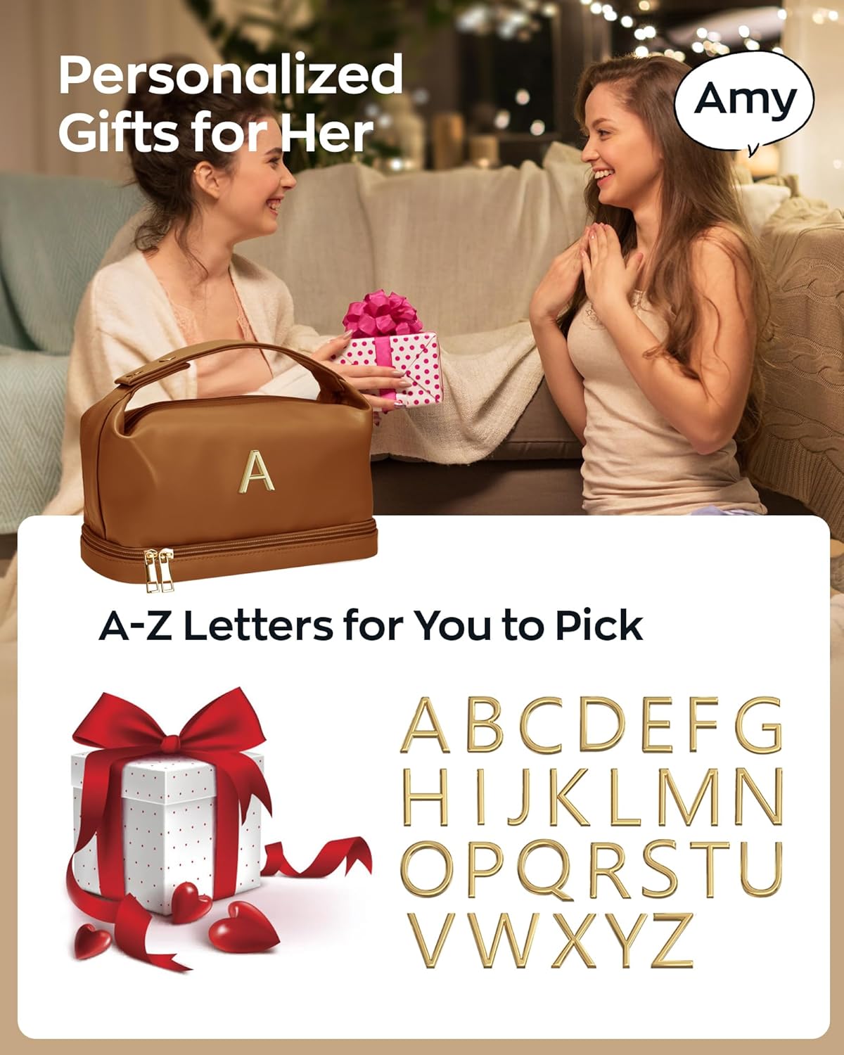 Gifts for Women 40s, Personalized Makeup Bag with Handle, Initial Double Layer Cosmetic Bag with Makeup Brush Organizer, Cute Cosmetic Pouch for Women, Gifts for Friends Female Mom